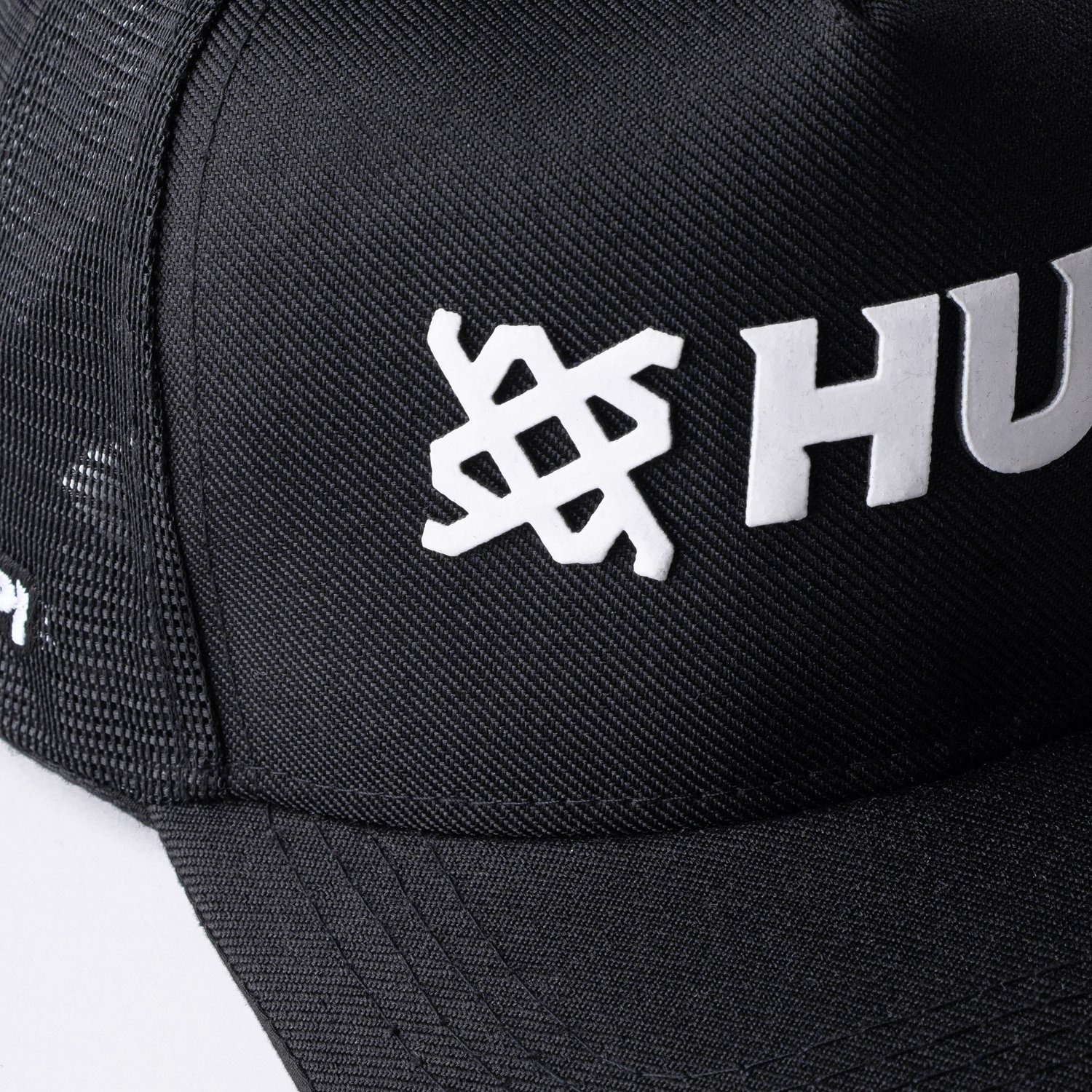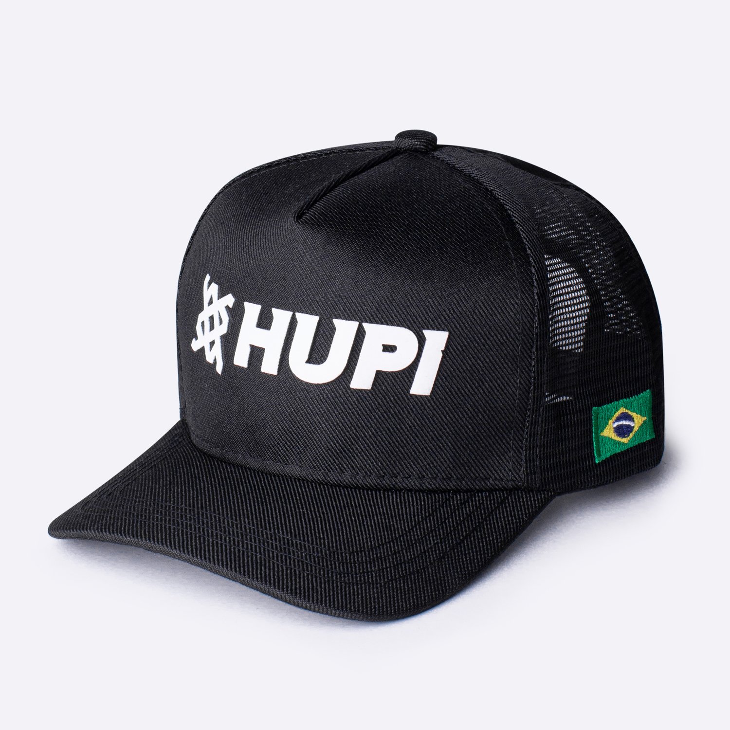 Emborrachado Frontal e Lateral: Exibe o logotipo da HUPI com destaque em emborrachado 3D na cor branca, adicionando um toque elegante e visível.