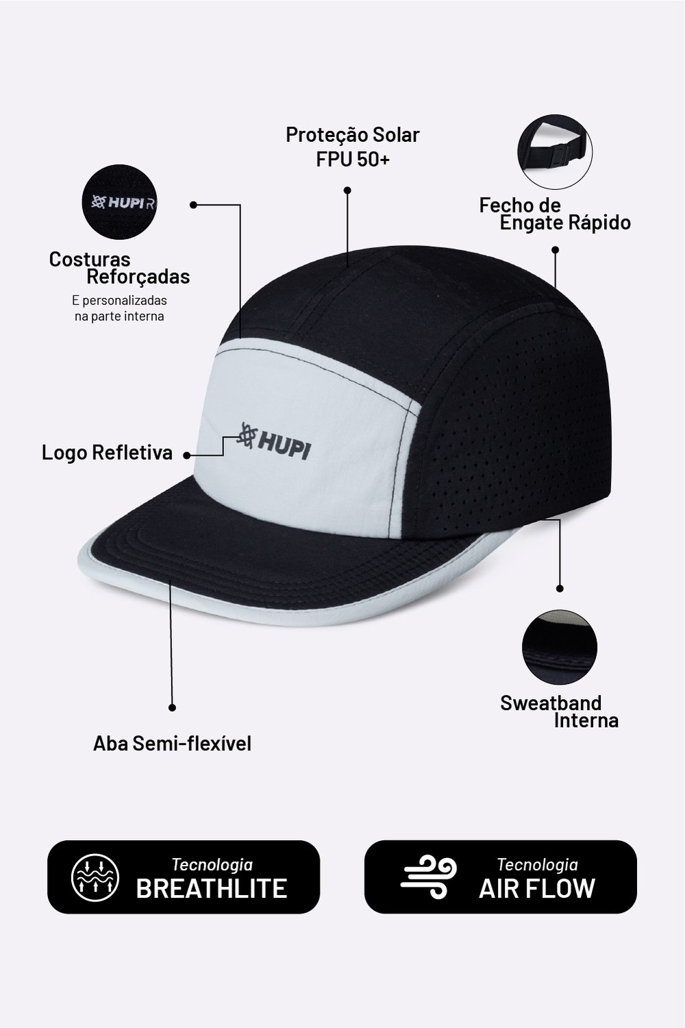Especificações Técnicas do Boné HUPI Run Supreme Air Preto e Cinza