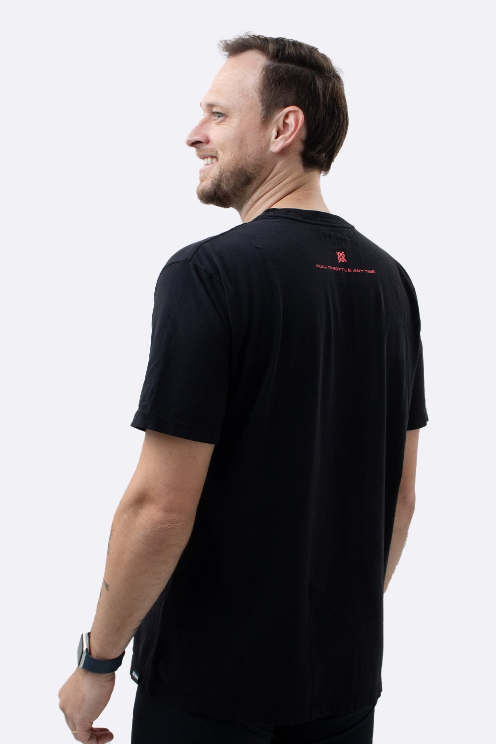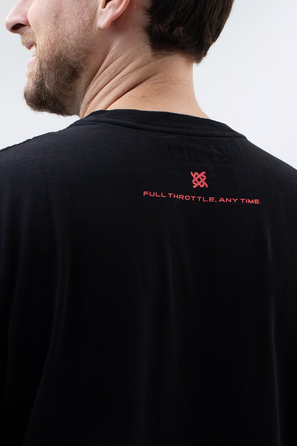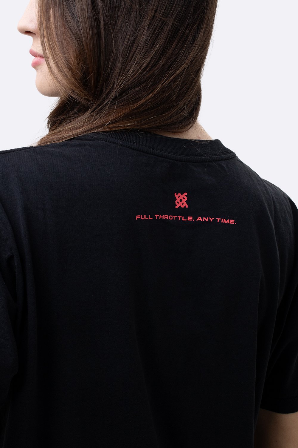 Estampa traseira: Frase “FULL THROTTLE. ANY TIME.” em aplicação discreta no alto das costas