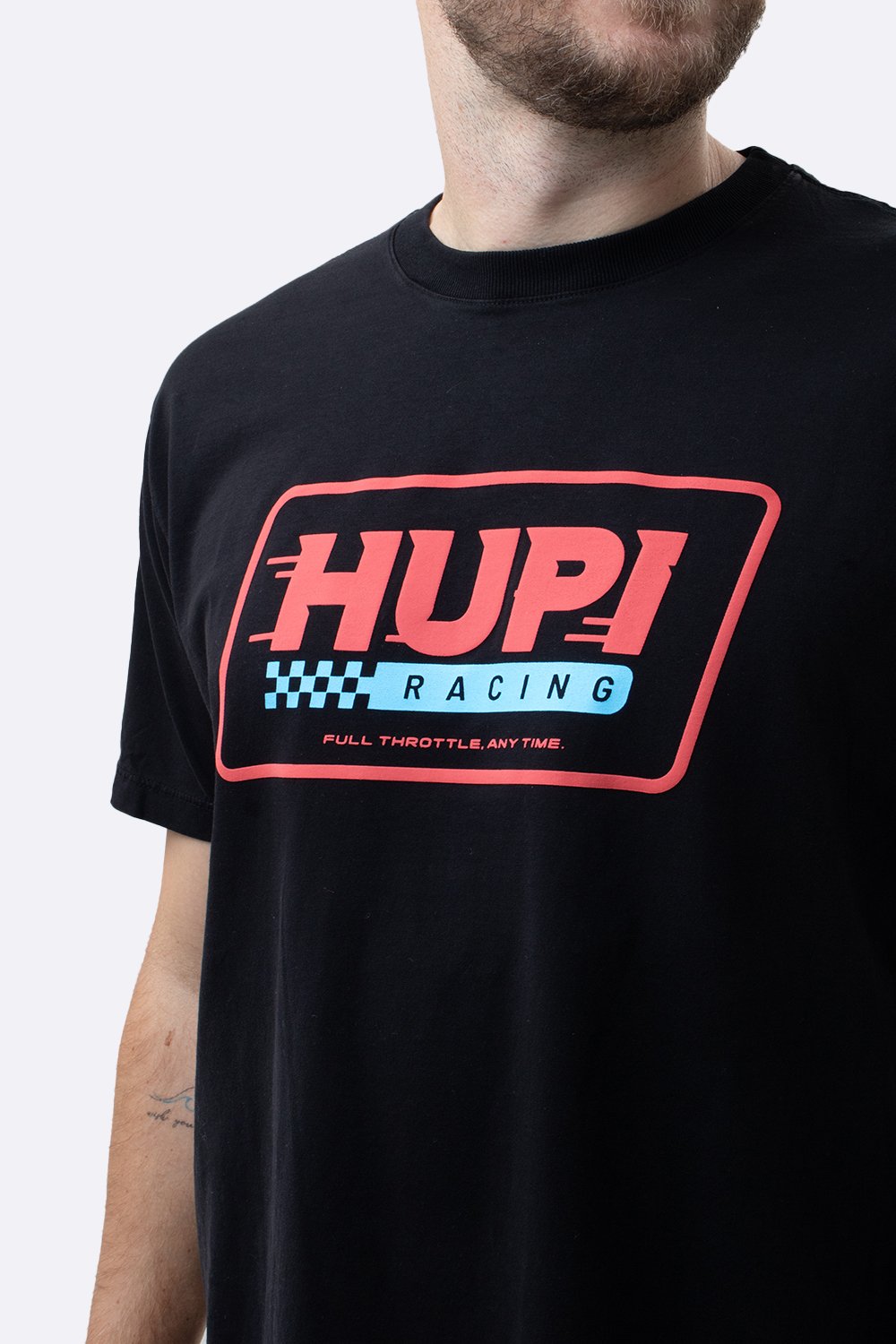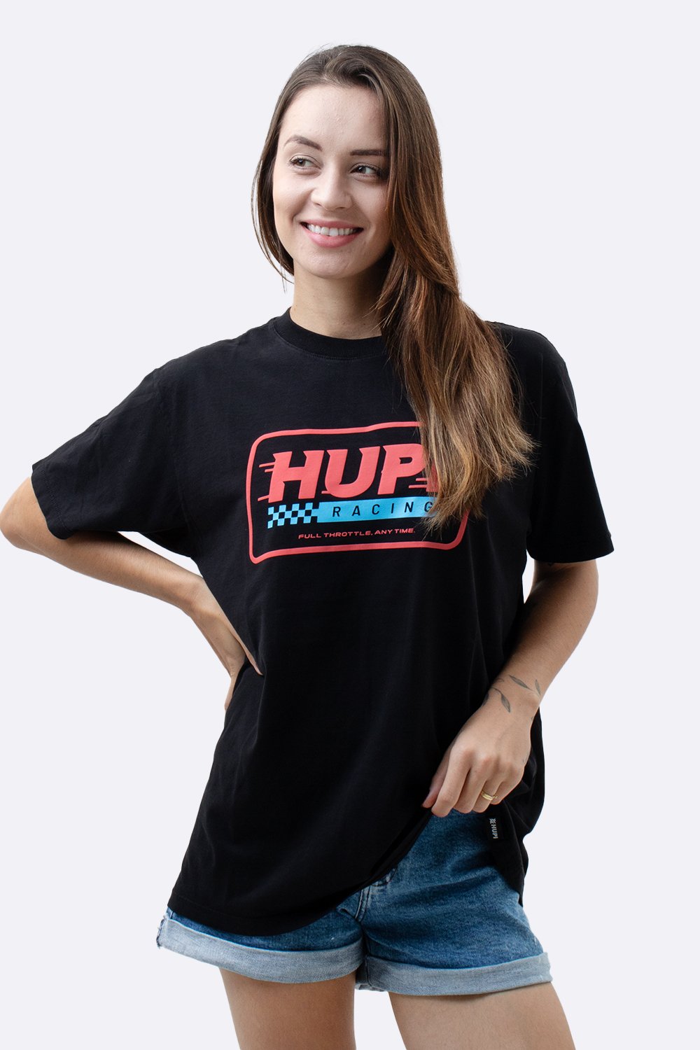 A estampa frontal apresenta o logo HUPI RACING em destaque, acompanhado da faixa quadriculada e da frase “FULL THROTTLE. ANY TIME.”, um reforço visual de que o ritmo não para.