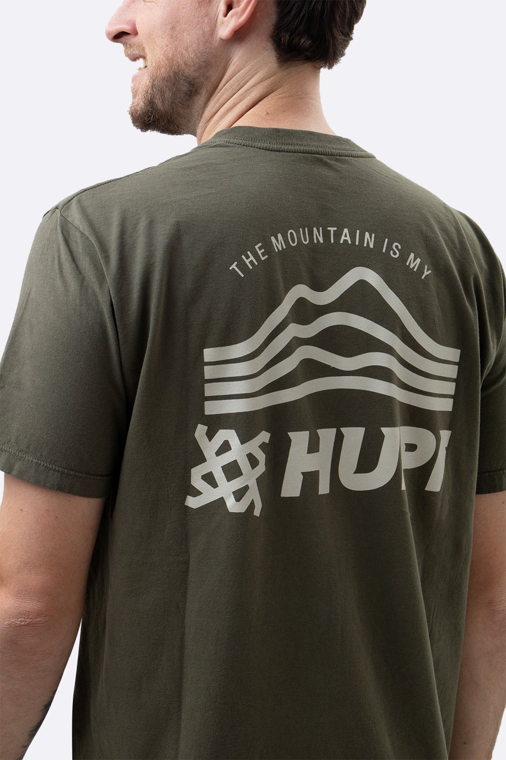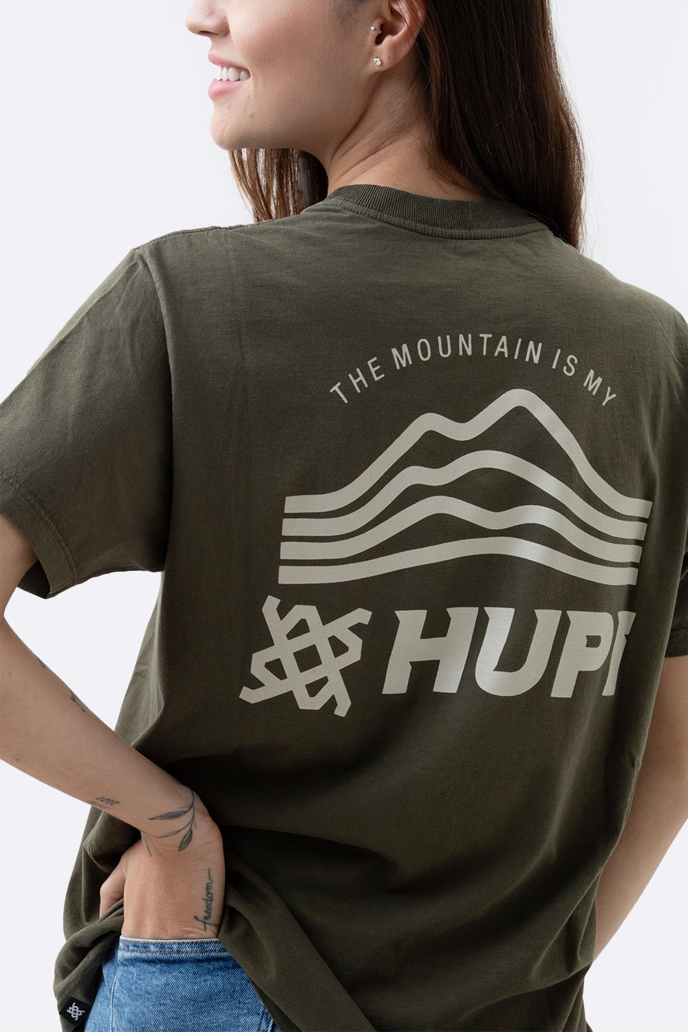 A estampa frontal exibe o logo HUPI acompanhado do ícone de montanhas, enquanto o destaque fica para a arte nas costas com a frase “THE MOUNTAIN IS MY” – um tributo à conexão com a natureza e aos desafios da altitude.