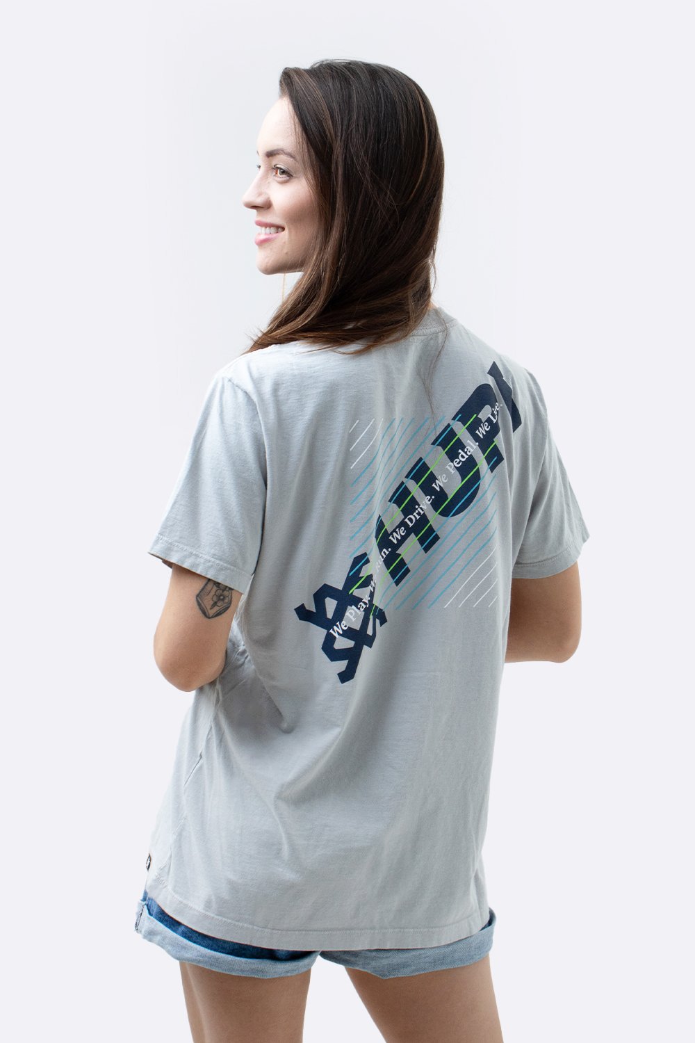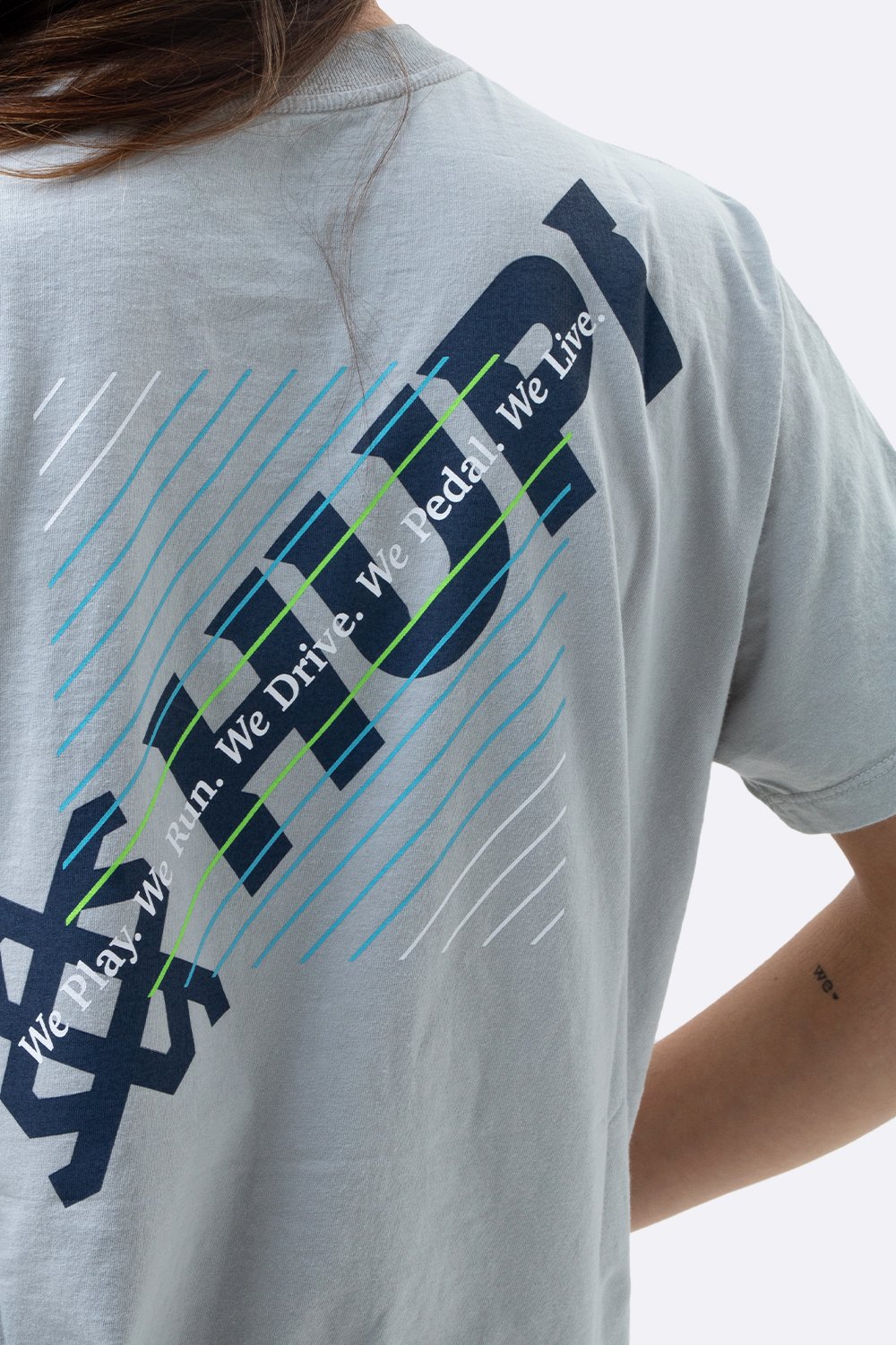 Estampa traseira: Logo HUPI com linhas diagonais e frase “We Play. We Run. We Drive. We Pedal. We Live.”