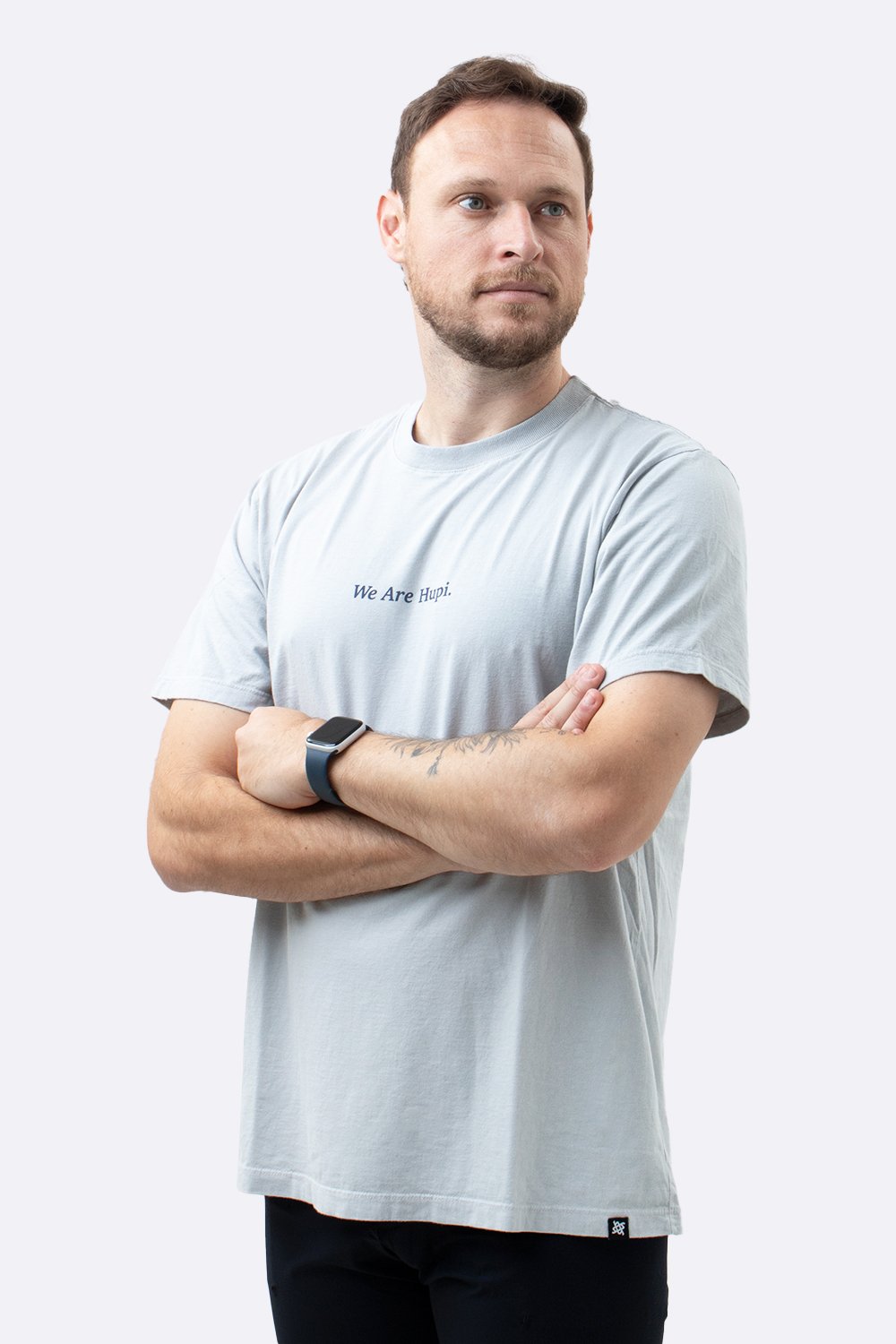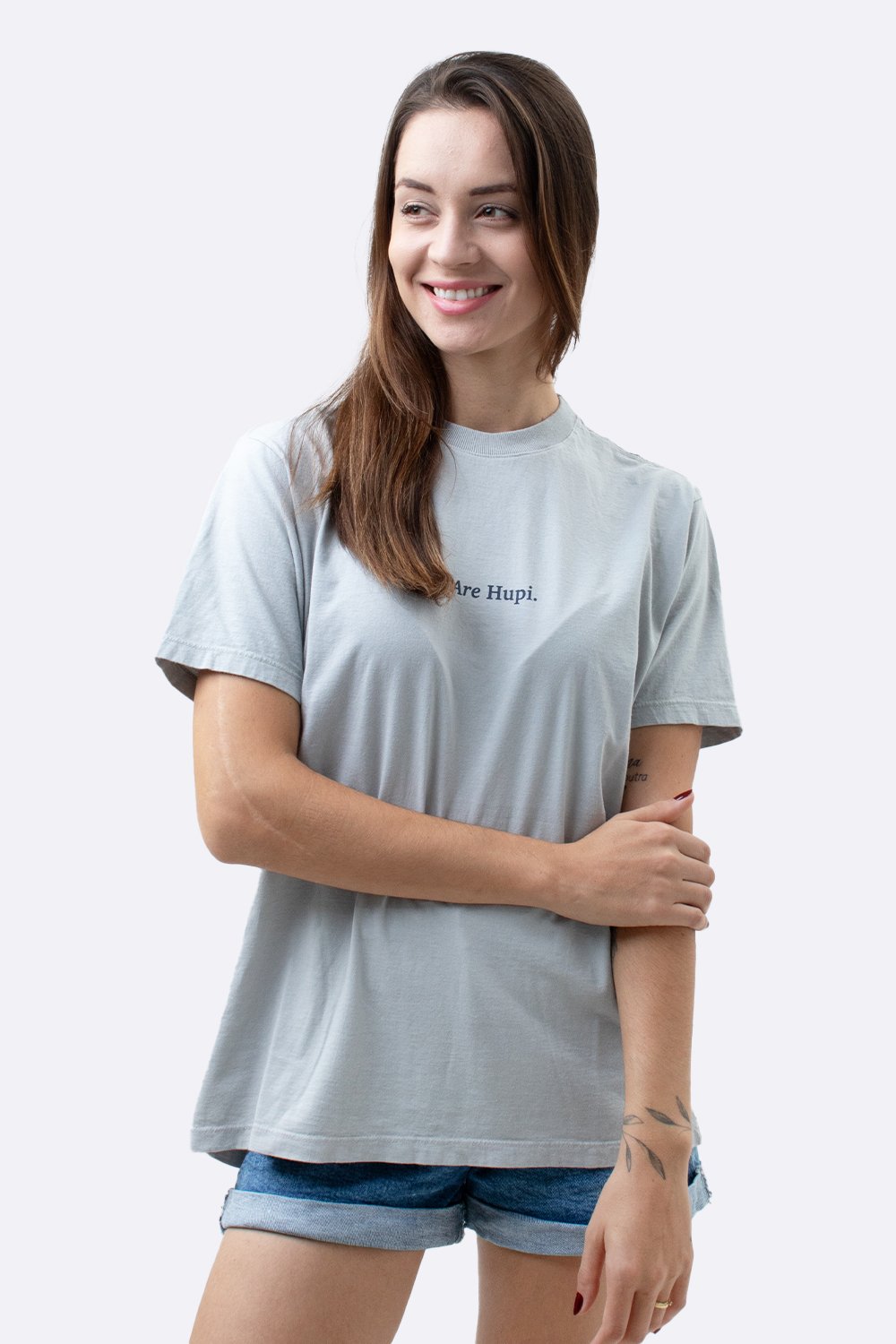 A estampa frontal centralizada traz a frase “We Are Hupi.” em silk azul escuro.