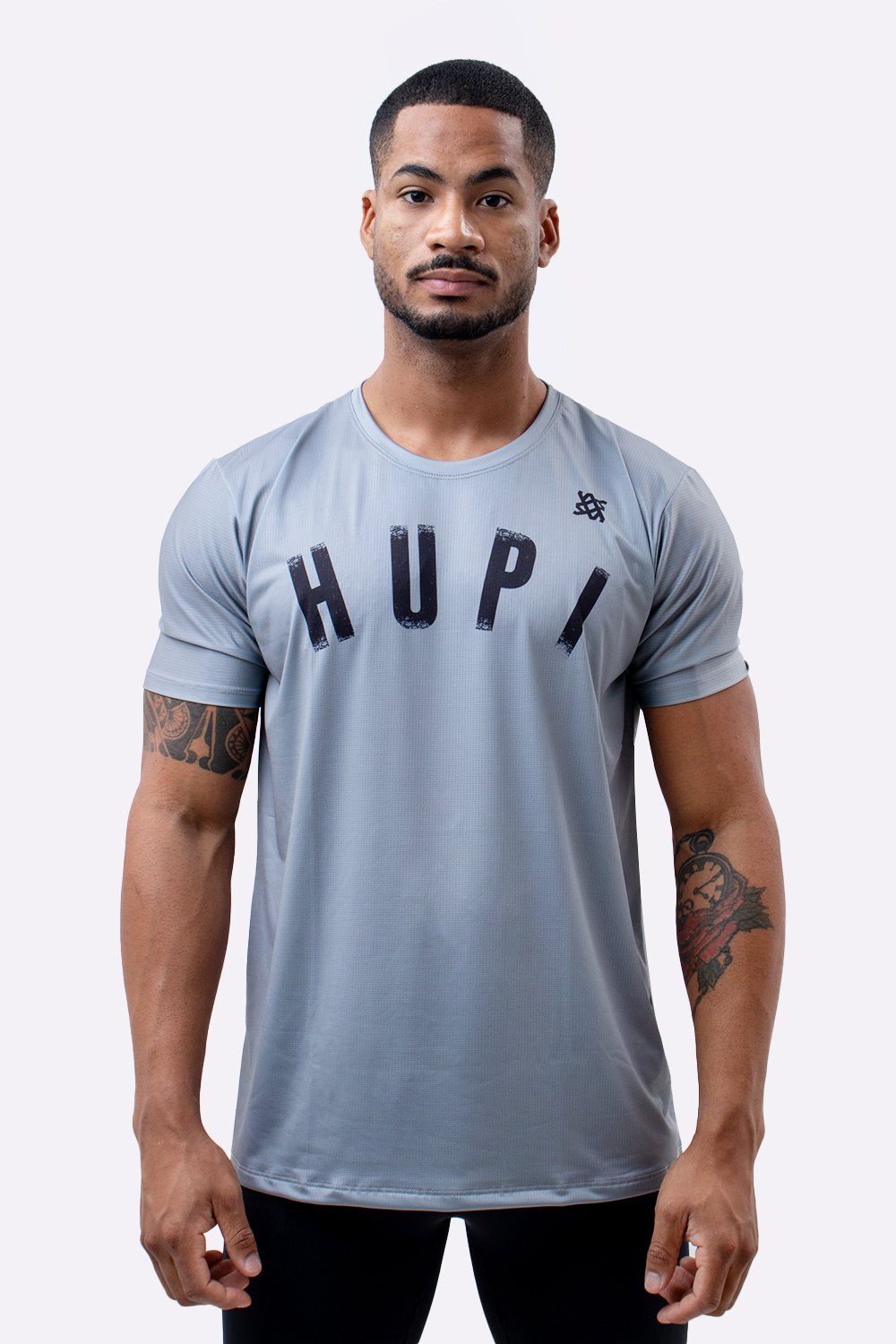 Estampa frontal HUPI: reforça a identidade esportiva da peça.