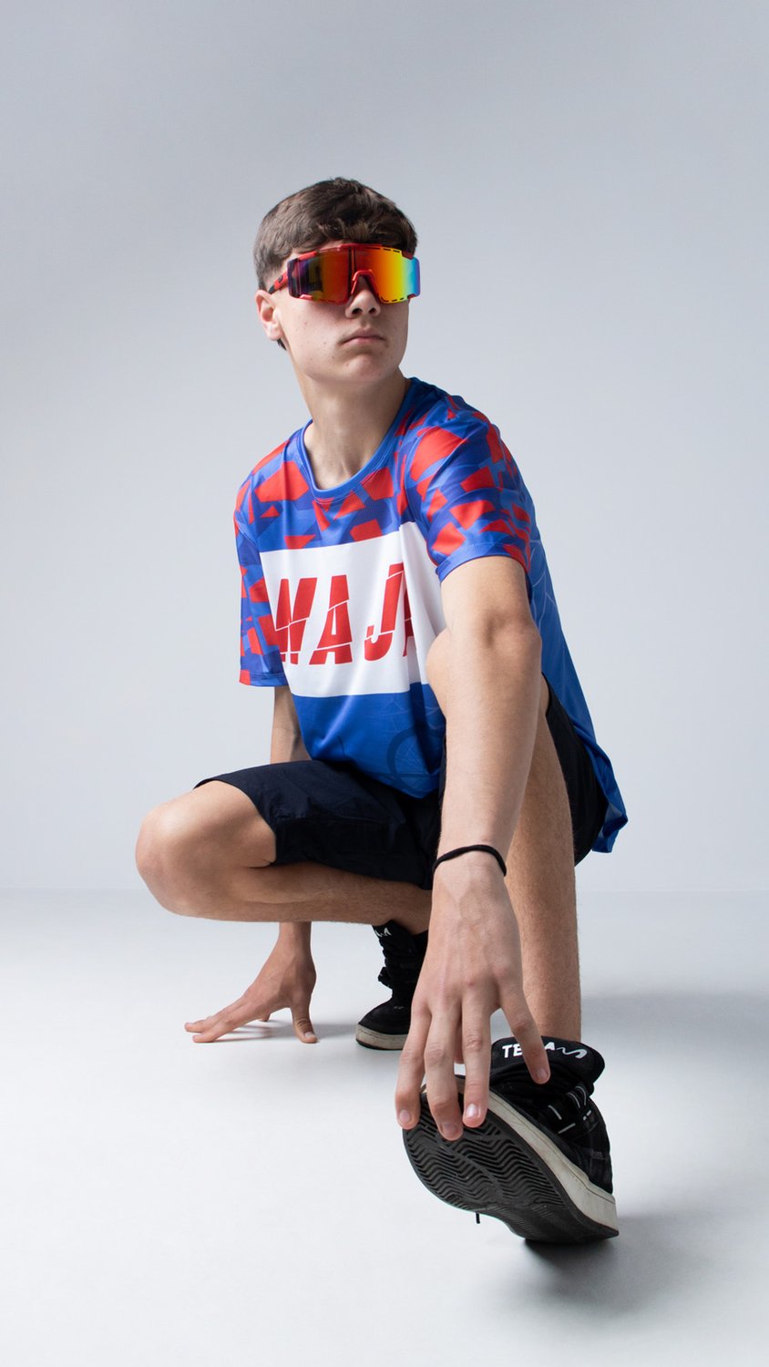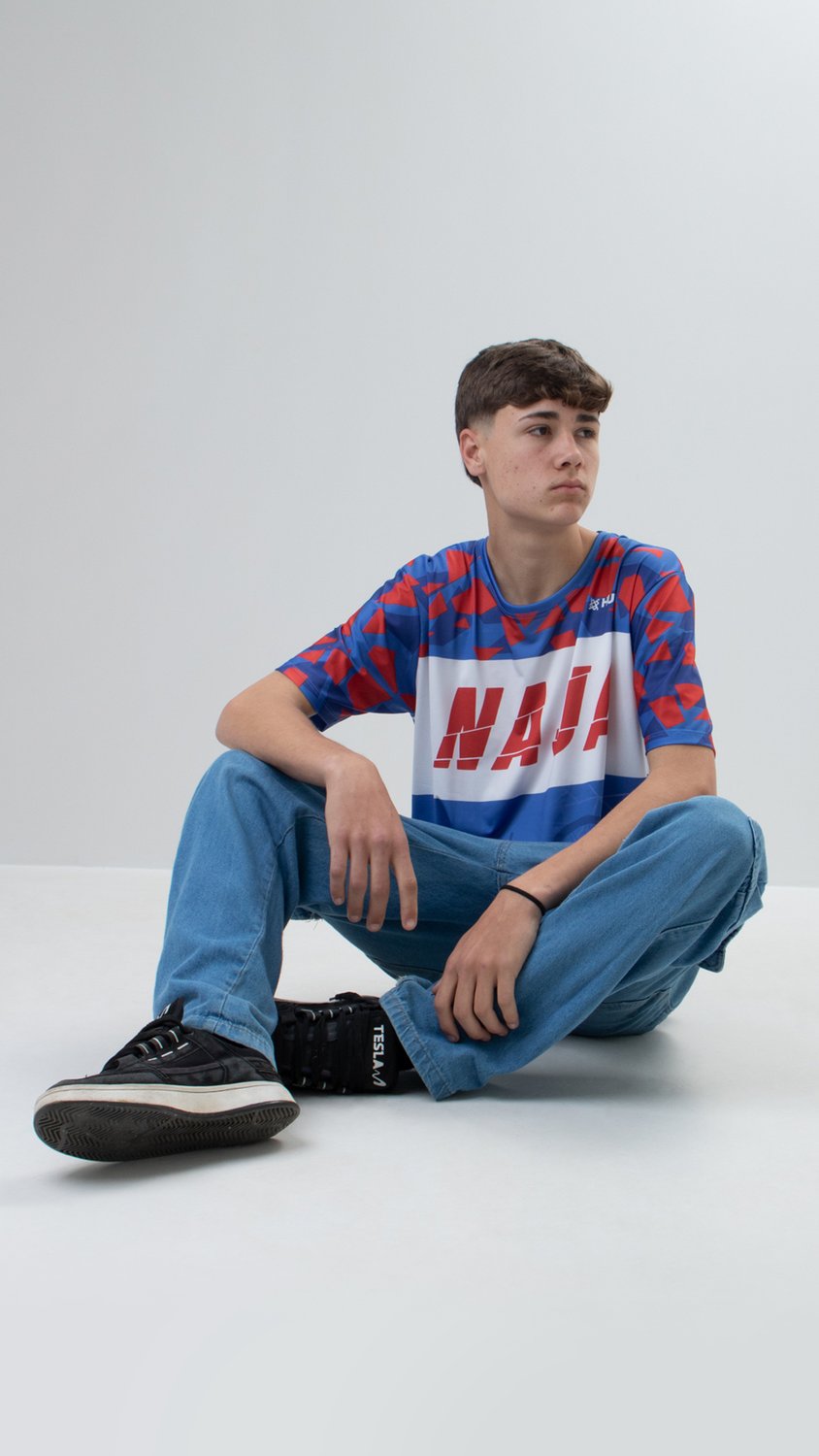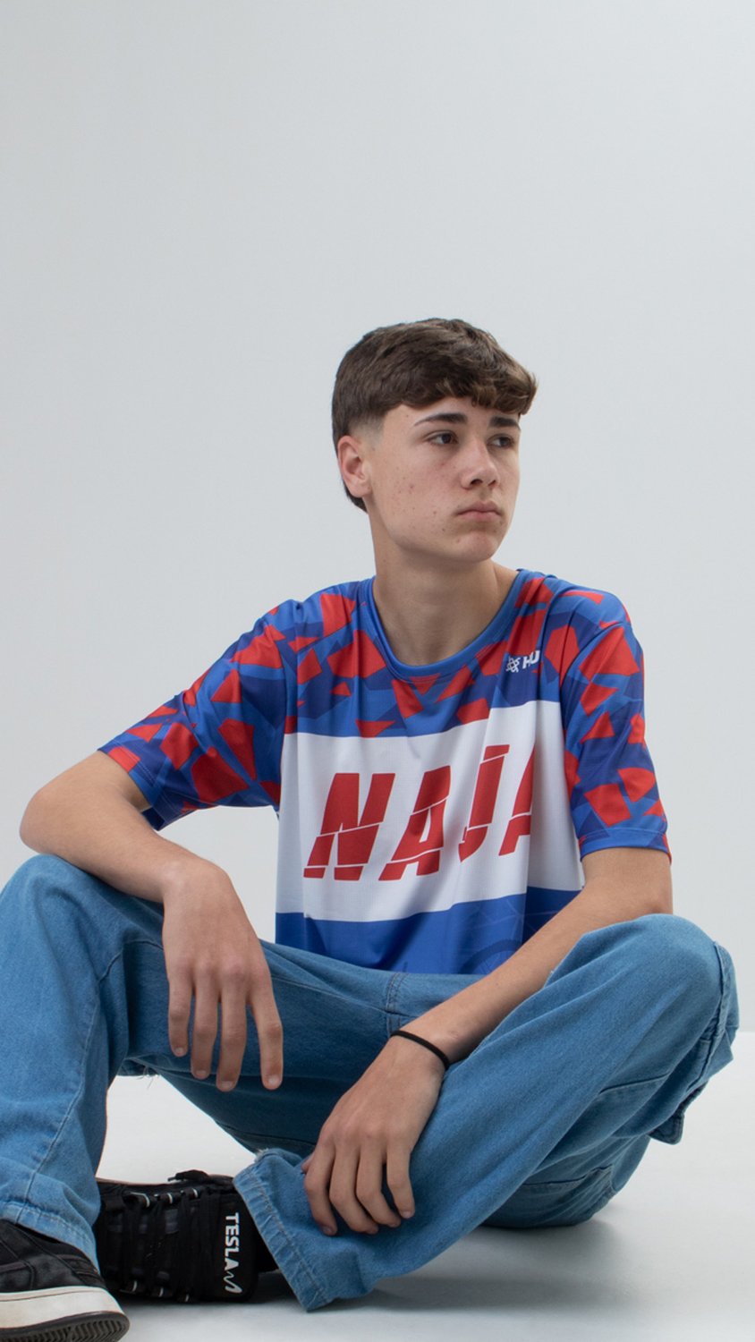 É a camiseta perfeita para quem quer se destacar sem precisar exagerar: a combinação de Azul/Vermelho vibrante com cinza cria um contraste moderno, enquanto a estampa Naja mostra personalidade e atitude.