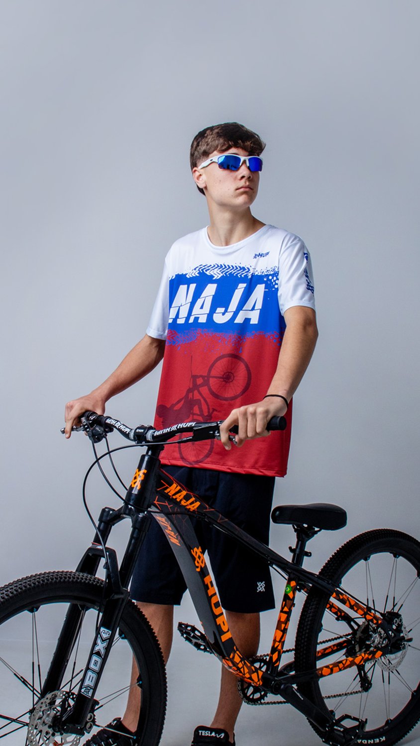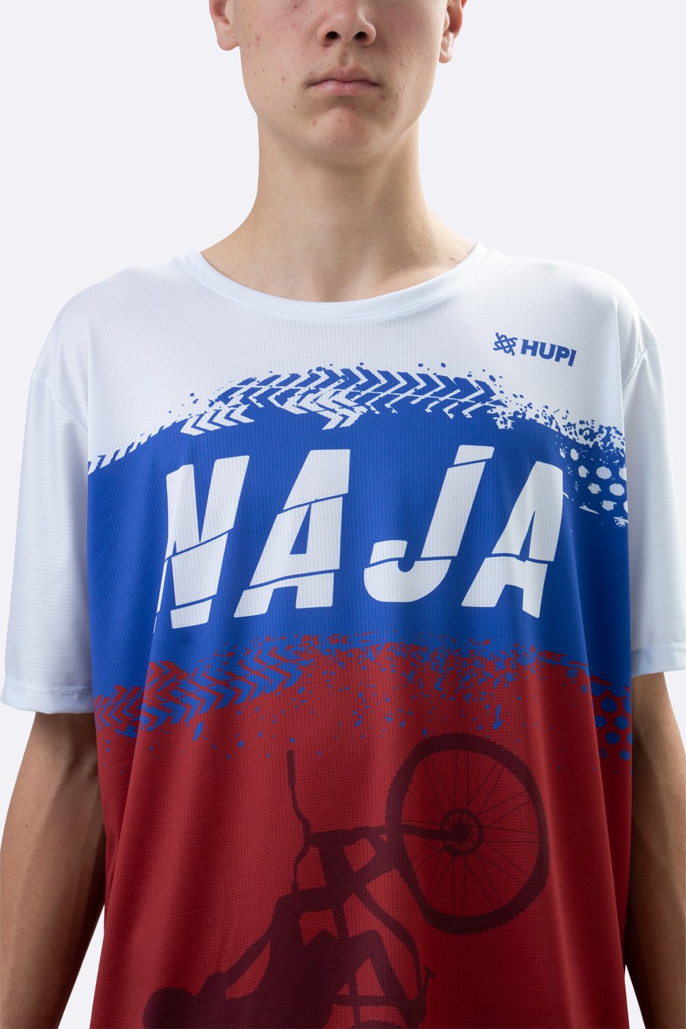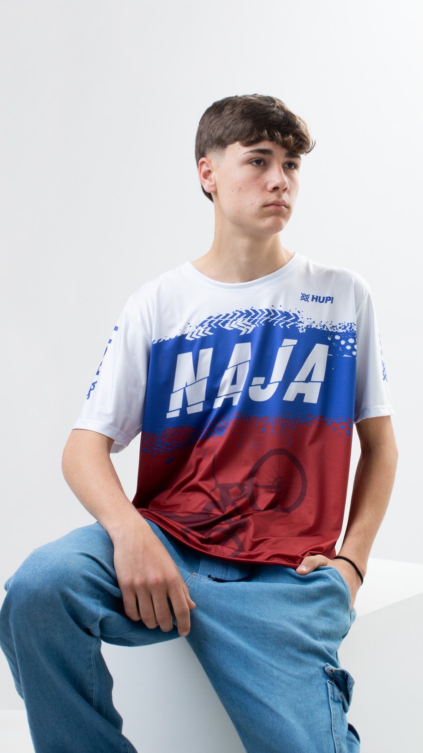 A Camiseta Masculina HUPI Bike Naja Branco/Azul é feita em tecido Dry Fit com microfuros estrategicamente distribuídos, que ajudam a manter o corpo arejado e seco, mesmo em dias quentes ou durante atividades mais ativas.