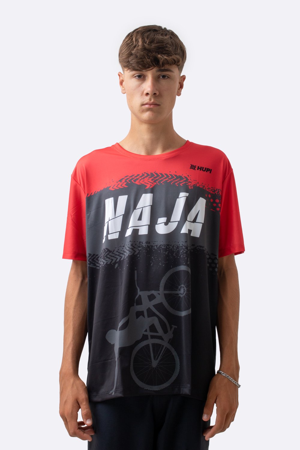 A Camiseta Masculina HUPI Bike Naja Preto/Vermelho é feita em tecido Dry Fit com microfuros estrategicamente distribuídos, que ajudam a manter o corpo arejado e seco, mesmo em dias quentes ou durante atividades mais ativas.