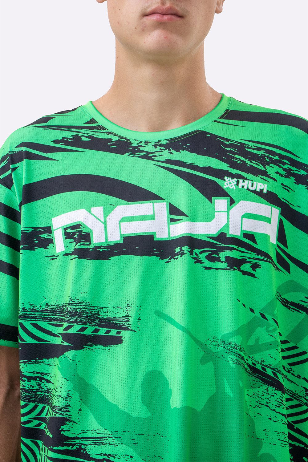 A estampa frontal Naja é aplicada com foco em durabilidade. O processo de aplicação foi pensado para manter definição visual e resistência ao desgaste natural do uso e das lavagens, preservando a identidade gráfica do produto ao longo do tempo. A combinação de Verde e Preto reforça o visual característico da linha Naja.