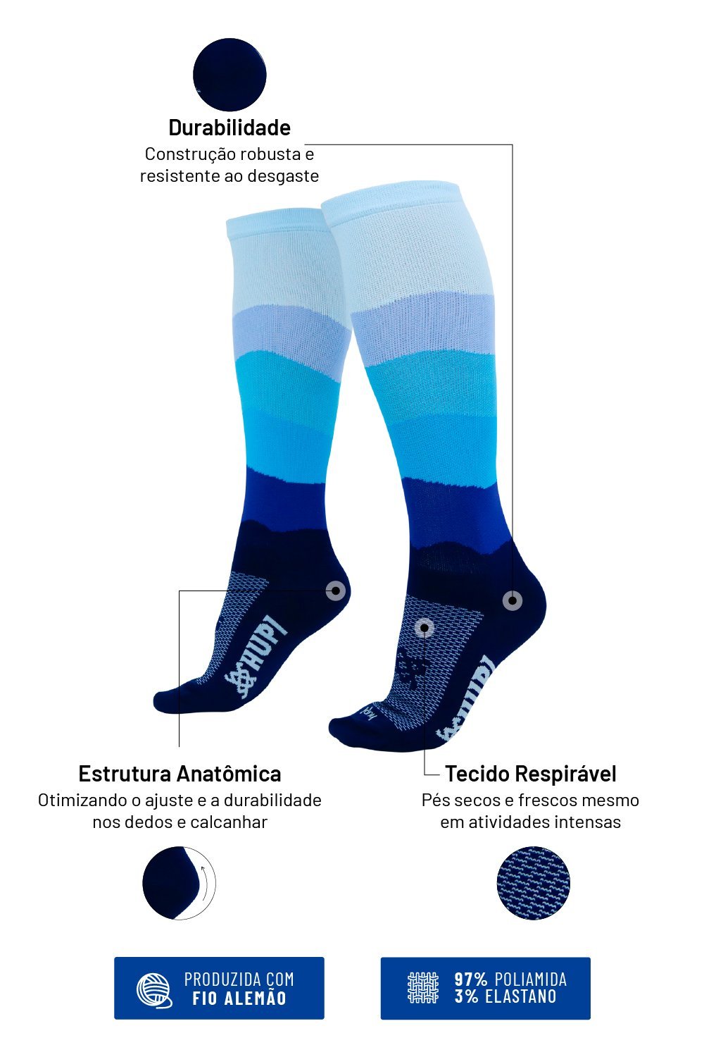 Atletas profissionais aprovam as meias da HUPI! Fabricadas em 97% Poliamida e 3% elastano!