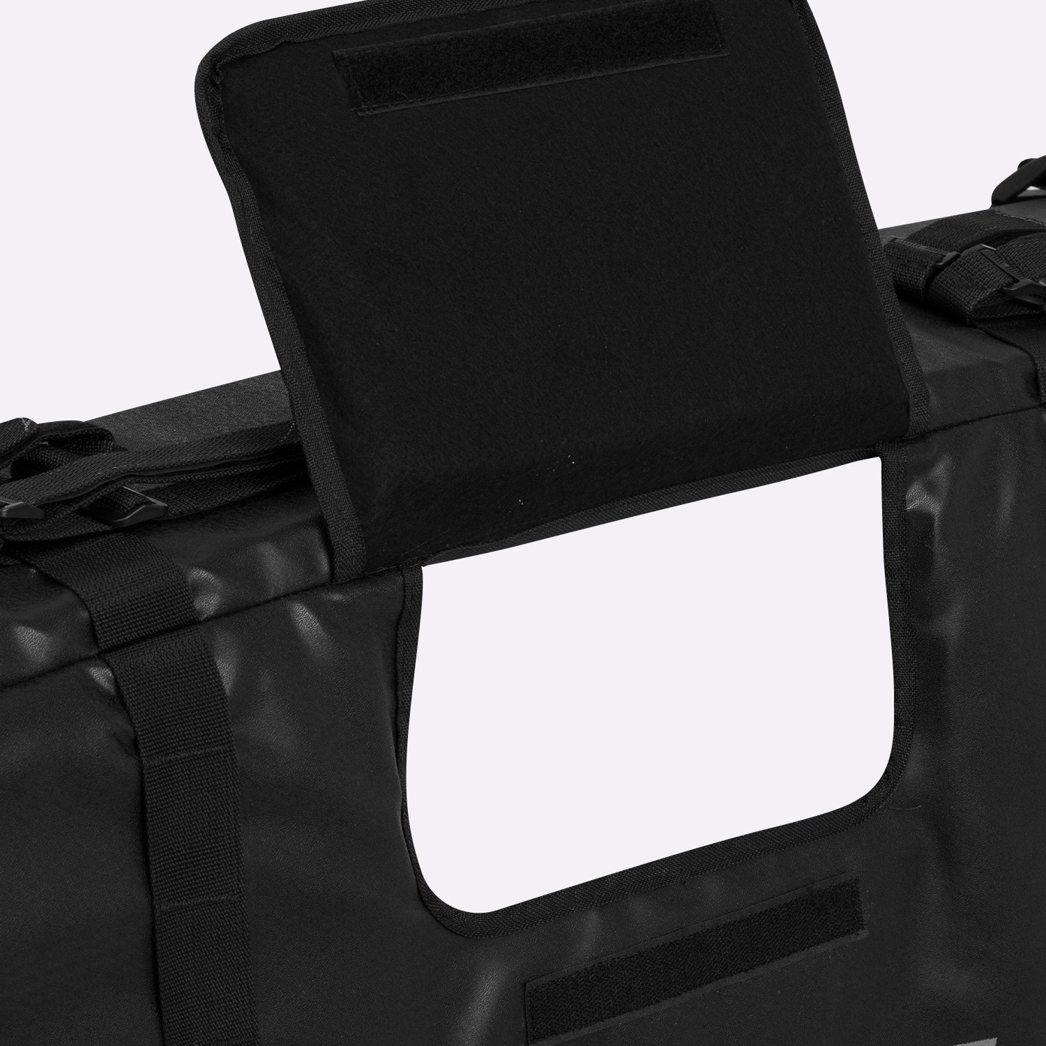 Compartimento com aba protetora e velcro: Facilita o acesso à trava da caçamba sem precisar retirar o pad.