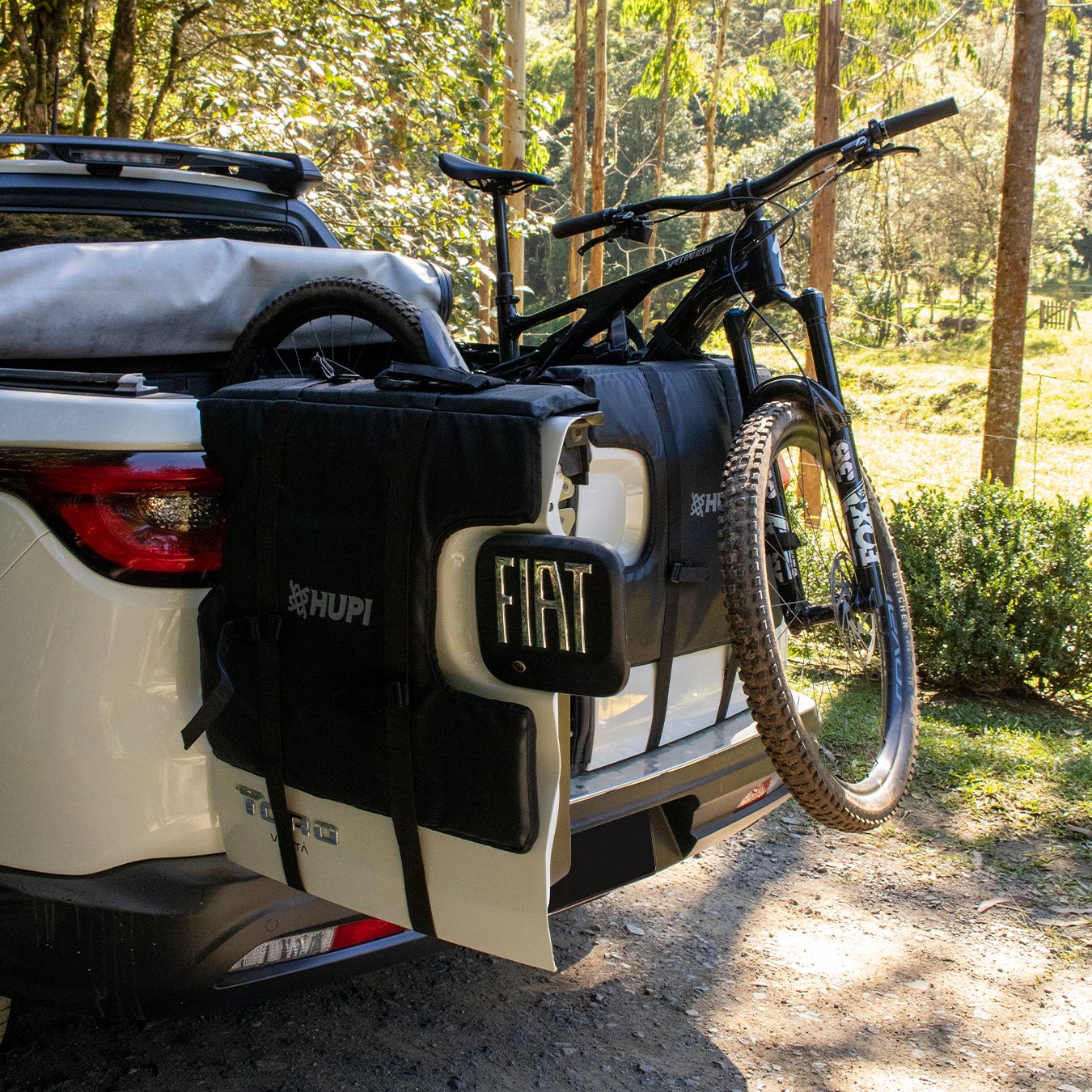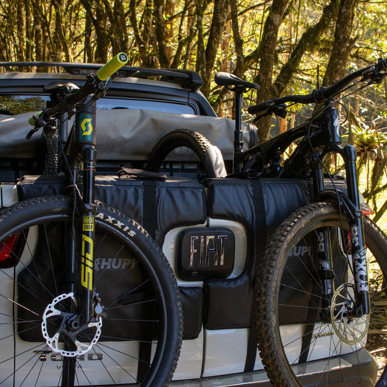 Transporte de bicicletas em Fiat Toro: Proteção eficiente sem bloquear a tampa bipartida.