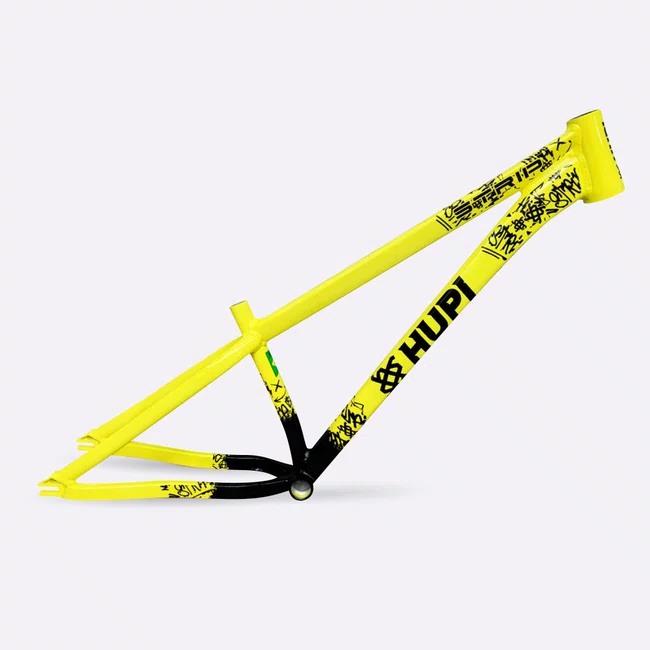 Sua geometria compacta favorece controle e estabilidade da bicicleta, enquanto o triângulo traseiro curto contribui para respostas rápidas nas manobras. A pintura na cor amarela com grafismos HUPI agrega identidade visual marcante ao produto final, criando um conjunto atrativo para montagens de bikes com estilo e personalidade.