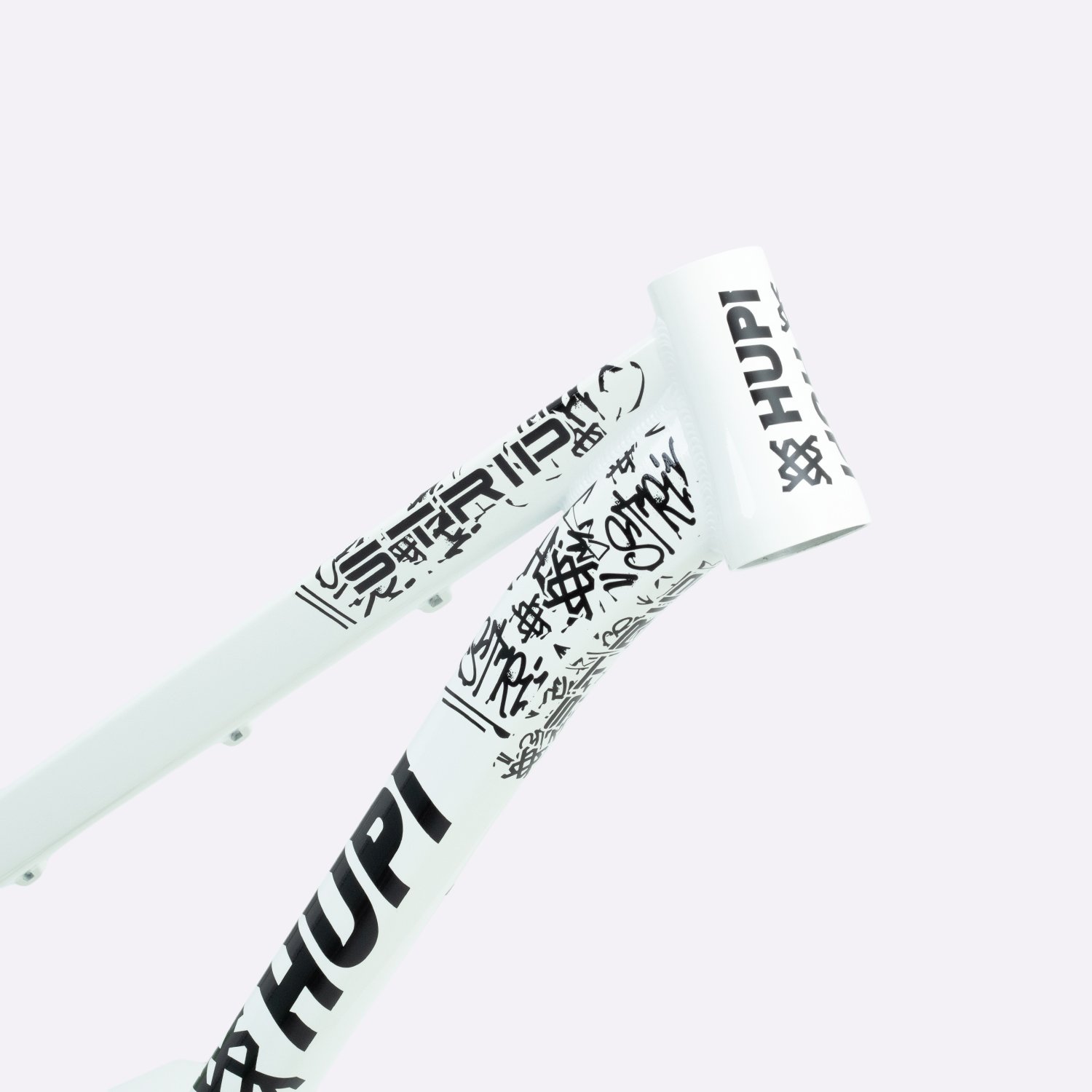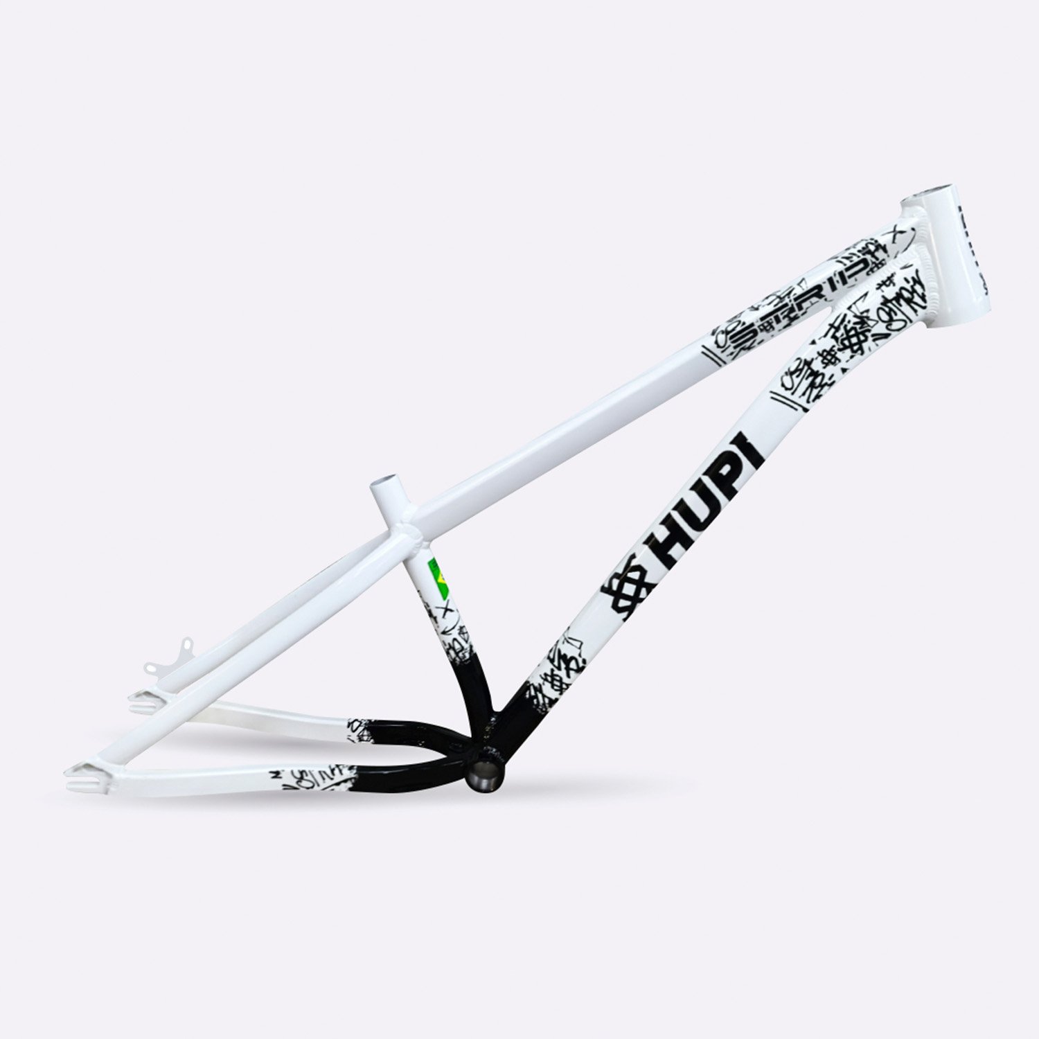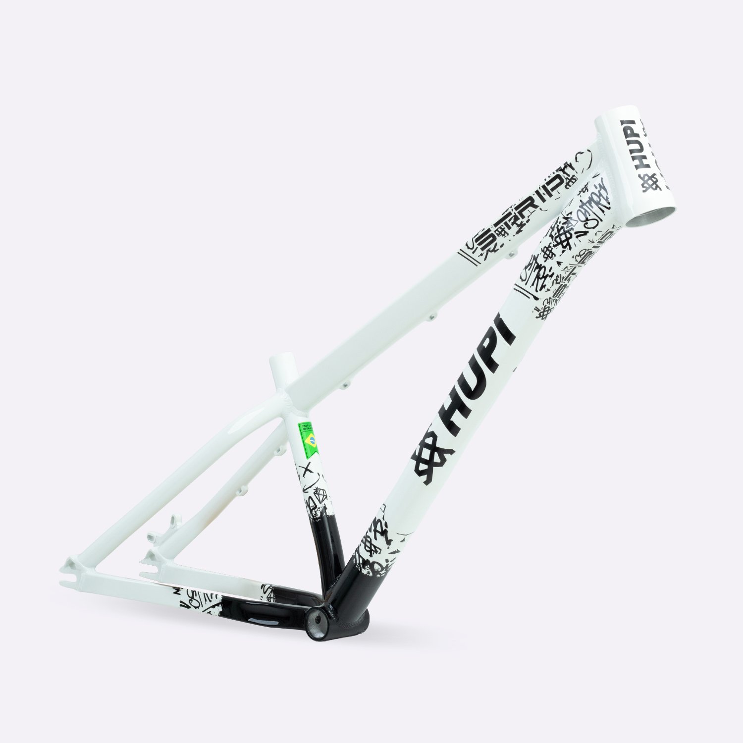 Sua geometria compacta favorece controle e estabilidade da bicicleta, enquanto o triângulo traseiro curto contribui para respostas rápidas nas manobras. A pintura na cor branca com grafismos HUPI agrega identidade visual marcante ao produto final, criando um conjunto atrativo para montagens de bikes com estilo e personalidade.