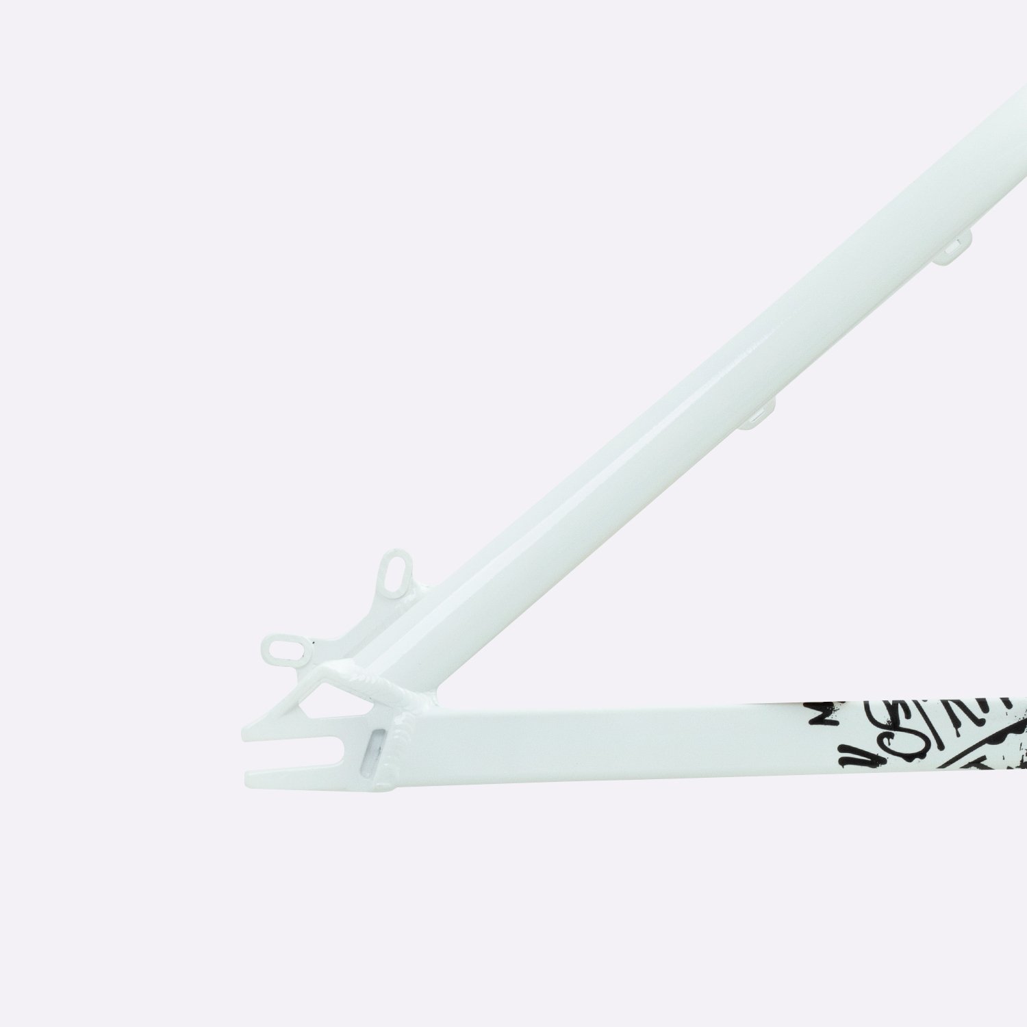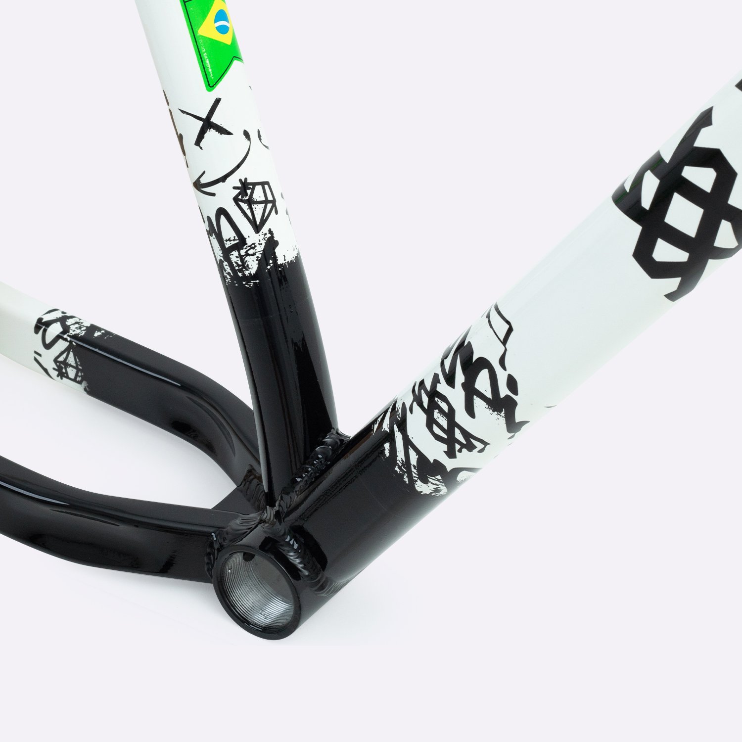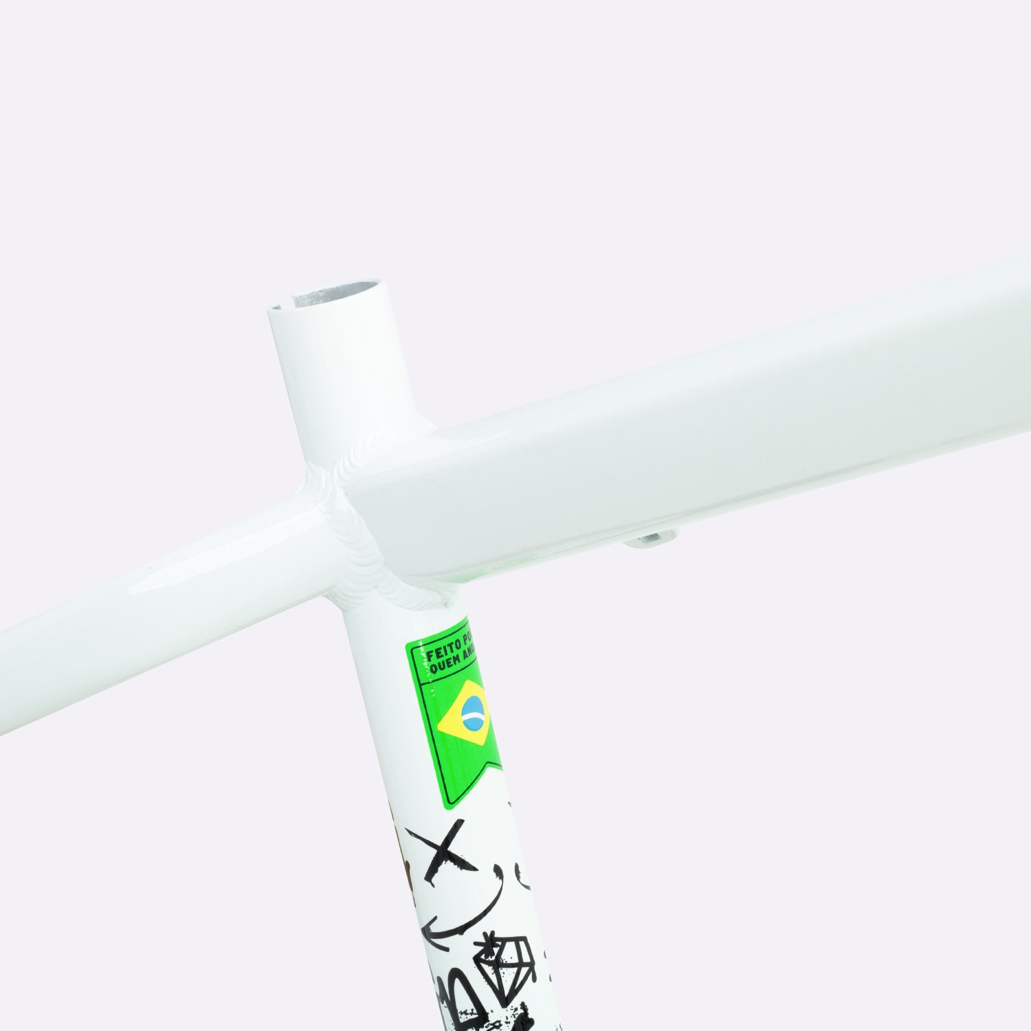 Sua geometria compacta favorece controle e estabilidade da bicicleta, enquanto o triângulo traseiro curto contribui para respostas rápidas nas manobras. A pintura na cor branca com grafismos HUPI agrega identidade visual marcante ao produto final, criando um conjunto atrativo para montagens de bikes com estilo e personalidade.