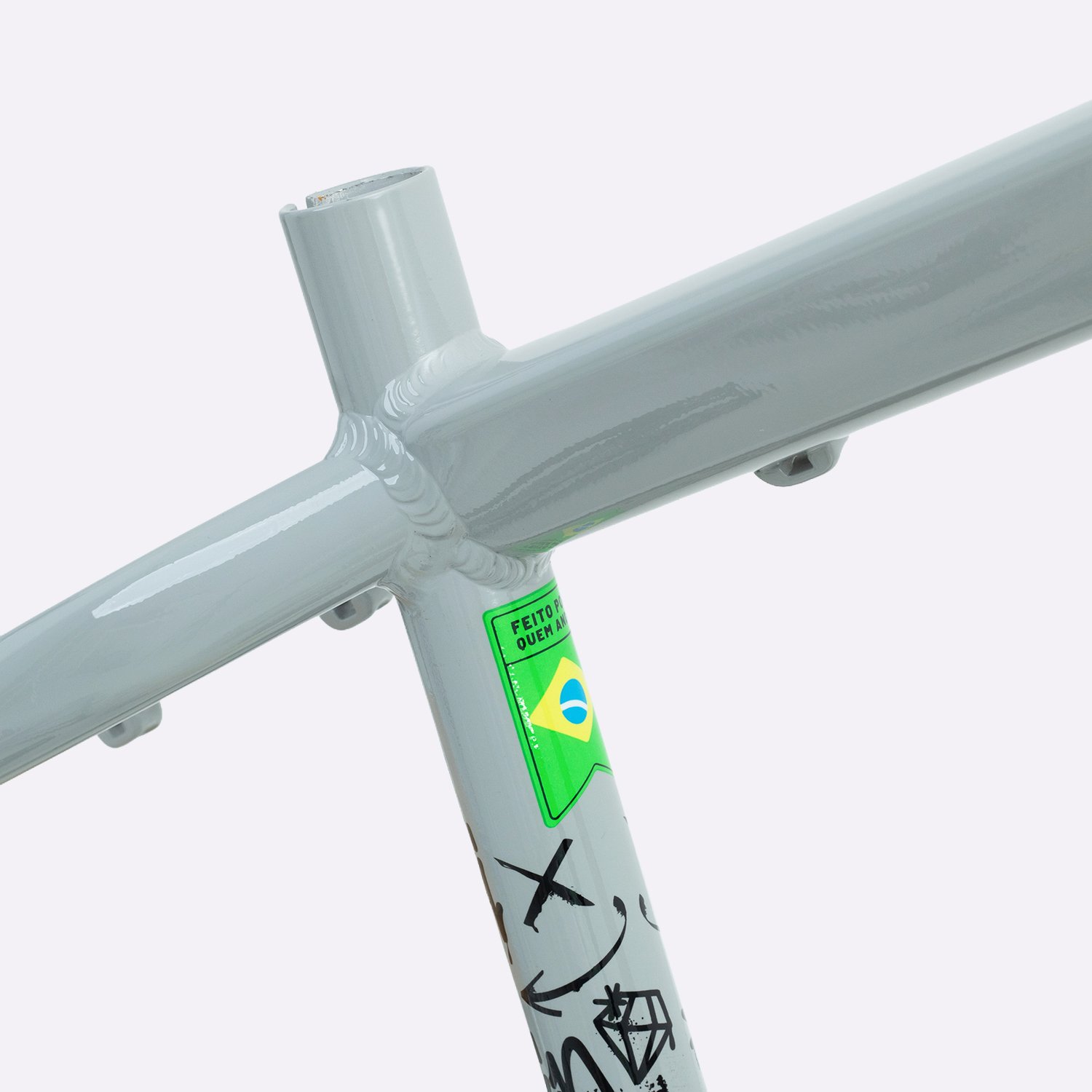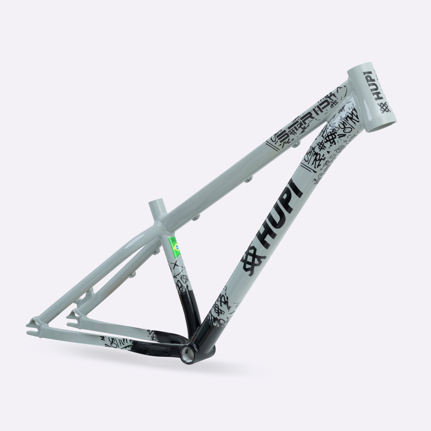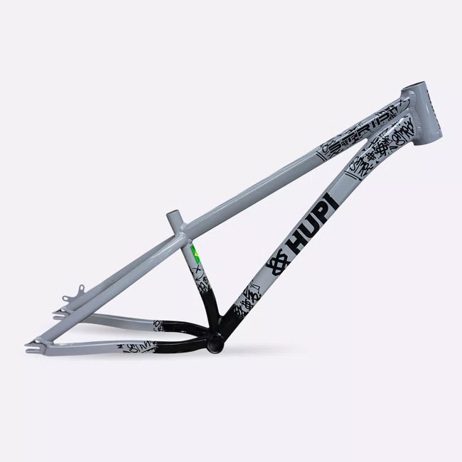 Sua geometria compacta favorece controle e estabilidade da bicicleta, enquanto o triângulo traseiro curto contribui para respostas rápidas nas manobras. A pintura na cor cinza com grafismos HUPI agrega identidade visual marcante ao produto final, criando um conjunto atrativo para montagens de bikes com estilo e personalidade.