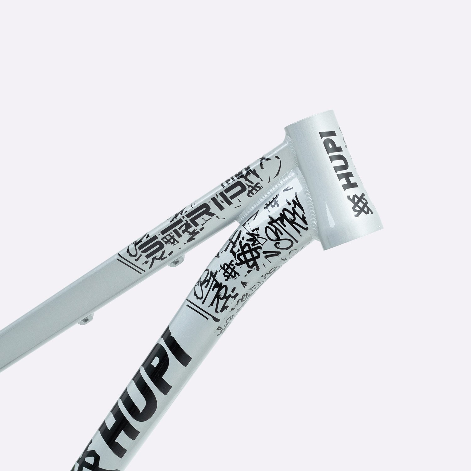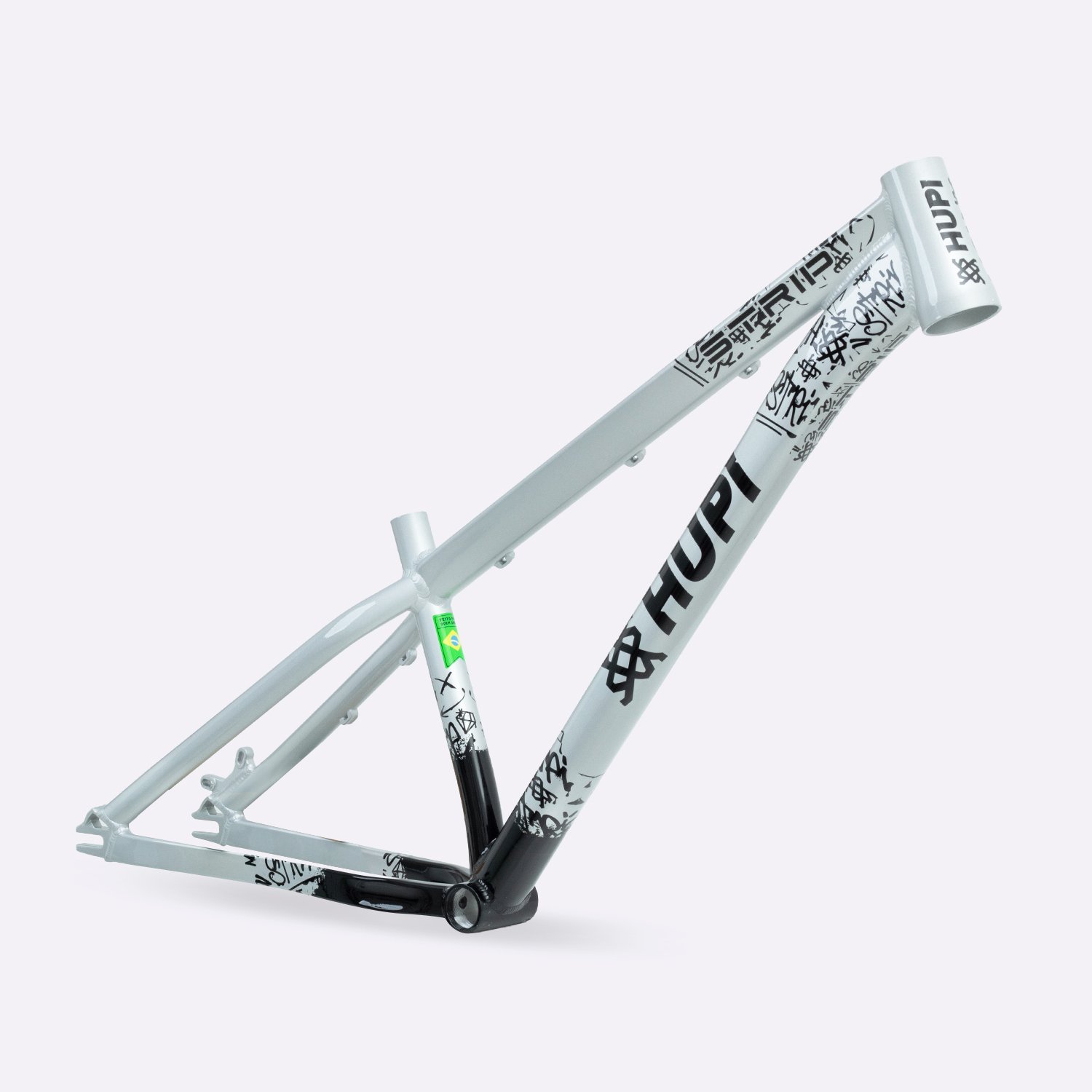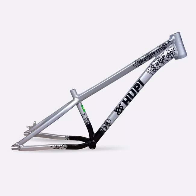 Sua geometria compacta favorece controle e estabilidade da bicicleta, enquanto o triângulo traseiro curto contribui para respostas rápidas nas manobras. A pintura na cor prata com grafismos HUPI agrega identidade visual marcante ao produto final, criando um conjunto atrativo para montagens de bikes com estilo e personalidade.