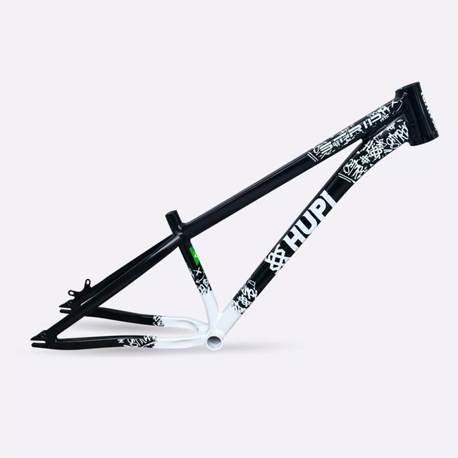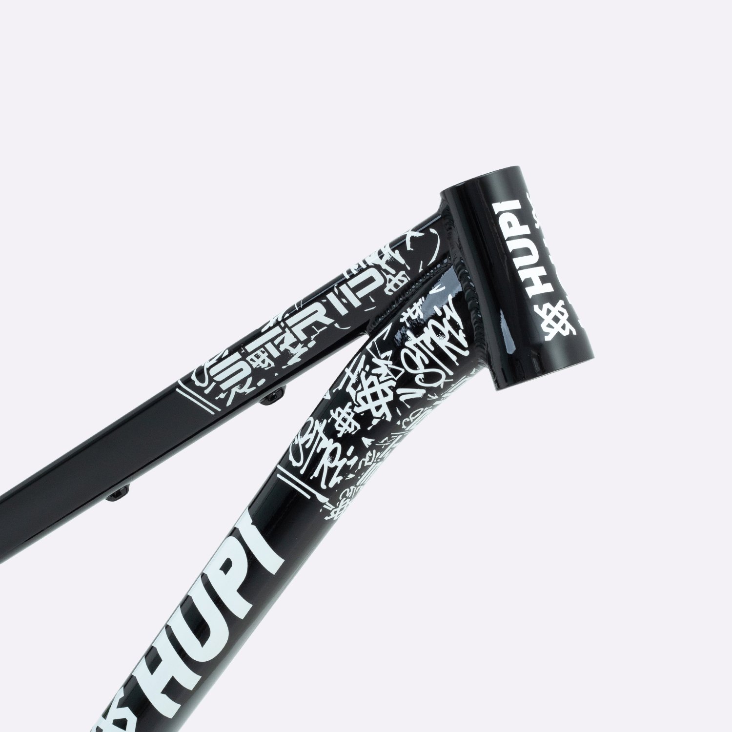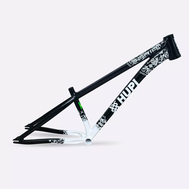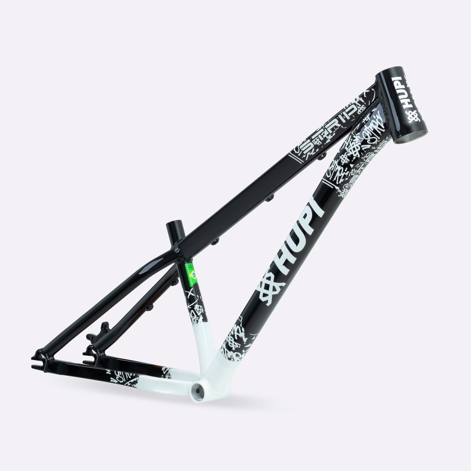 Sua geometria compacta favorece controle e estabilidade da bicicleta, enquanto o triângulo traseiro curto contribui para respostas rápidas nas manobras. A pintura na cor preta com grafismos HUPI agrega identidade visual marcante ao produto final, criando um conjunto atrativo para montagens de bikes com estilo e personalidade.