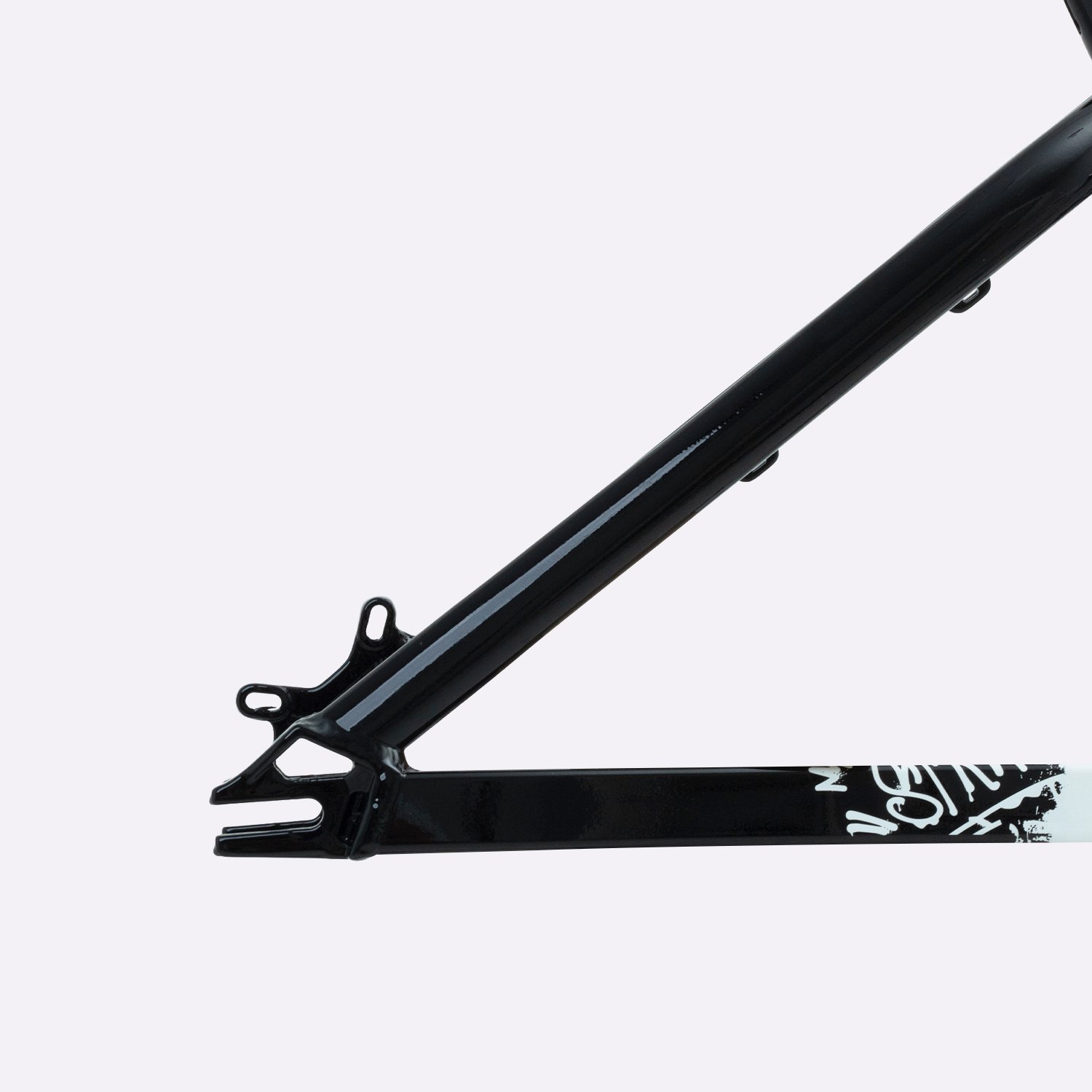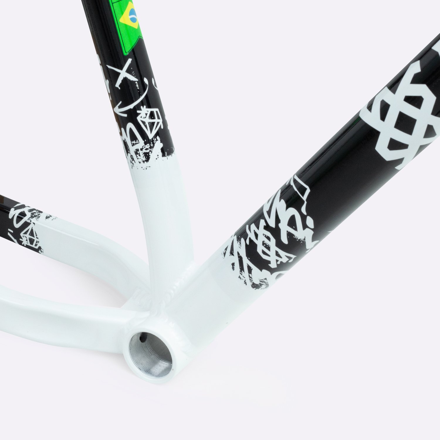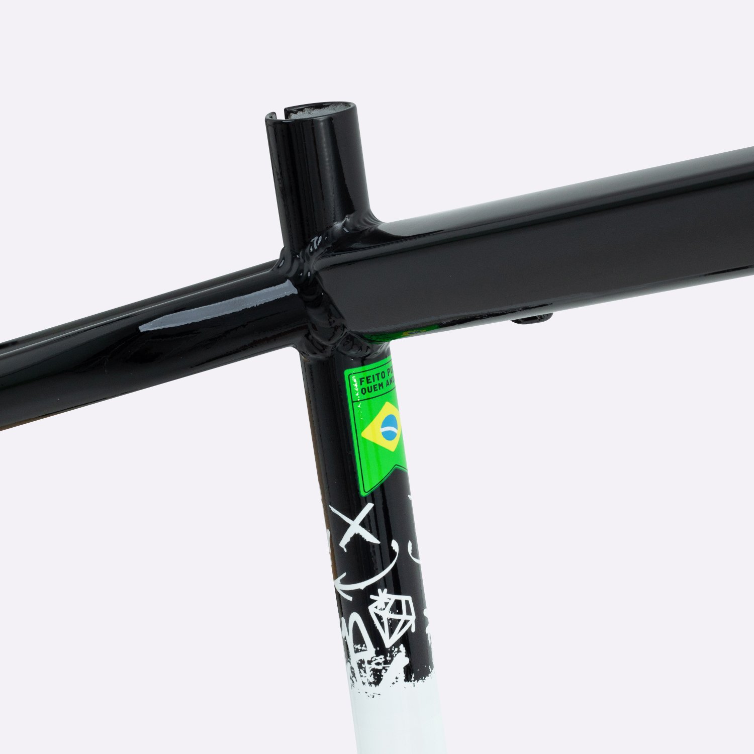 Sua geometria compacta favorece controle e estabilidade da bicicleta, enquanto o triângulo traseiro curto contribui para respostas rápidas nas manobras. A pintura na cor preta com grafismos HUPI agrega identidade visual marcante ao produto final, criando um conjunto atrativo para montagens de bikes com estilo e personalidade.