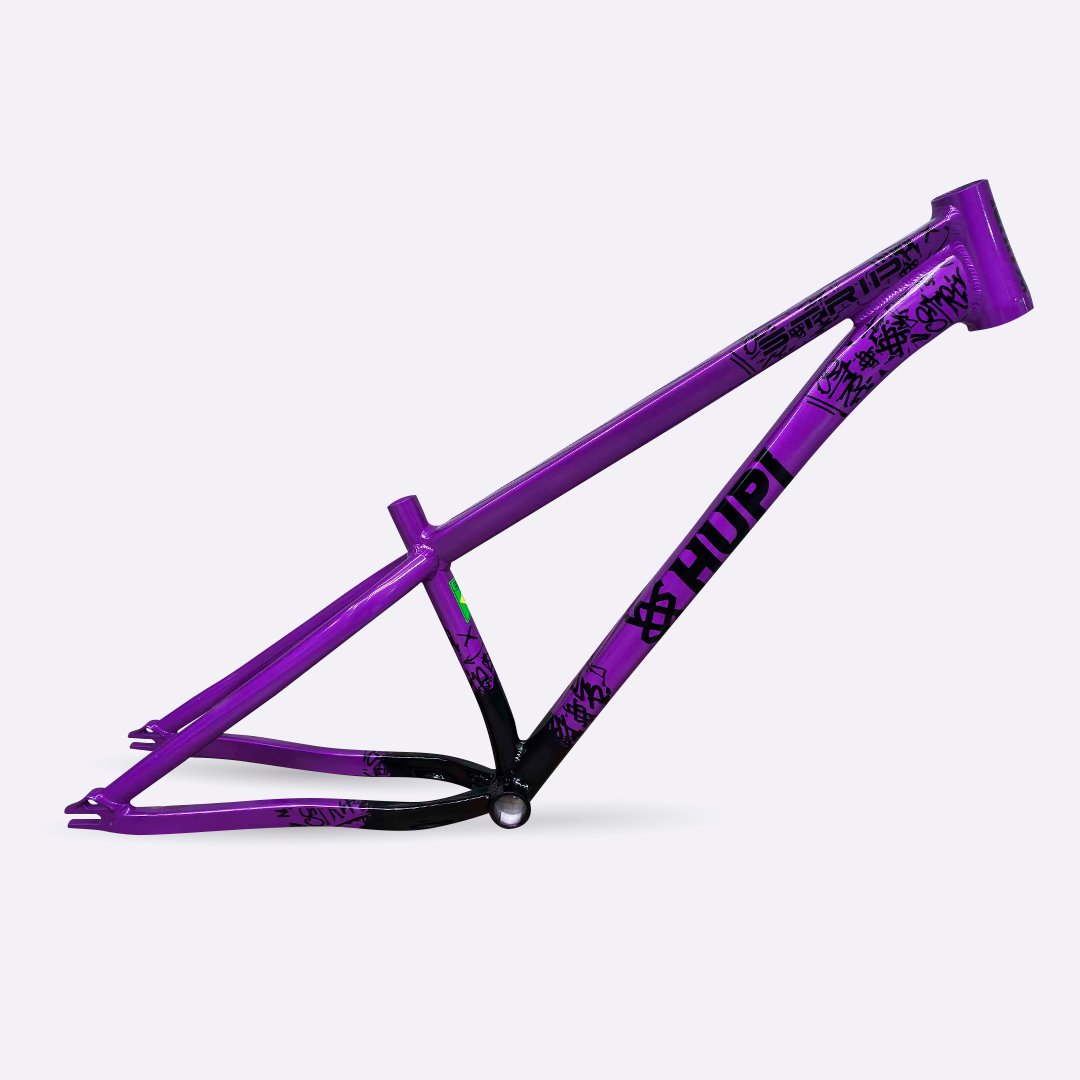 Sua geometria compacta favorece controle e estabilidade da bicicleta, enquanto o triângulo traseiro curto contribui para respostas rápidas nas manobras. A pintura na cor roxa com grafismos HUPI agrega identidade visual marcante ao produto final, criando um conjunto atrativo para montagens de bikes com estilo e personalidade.