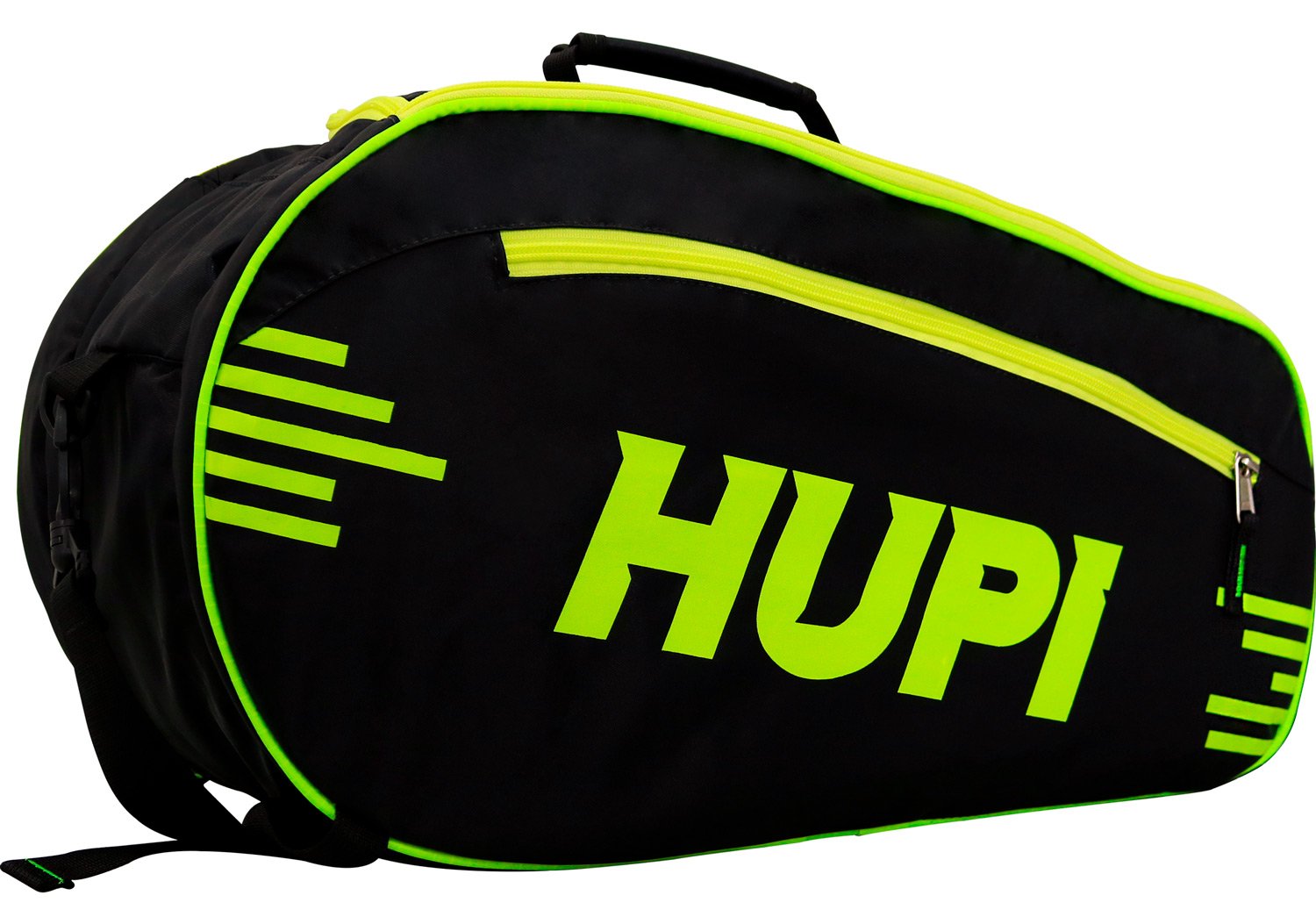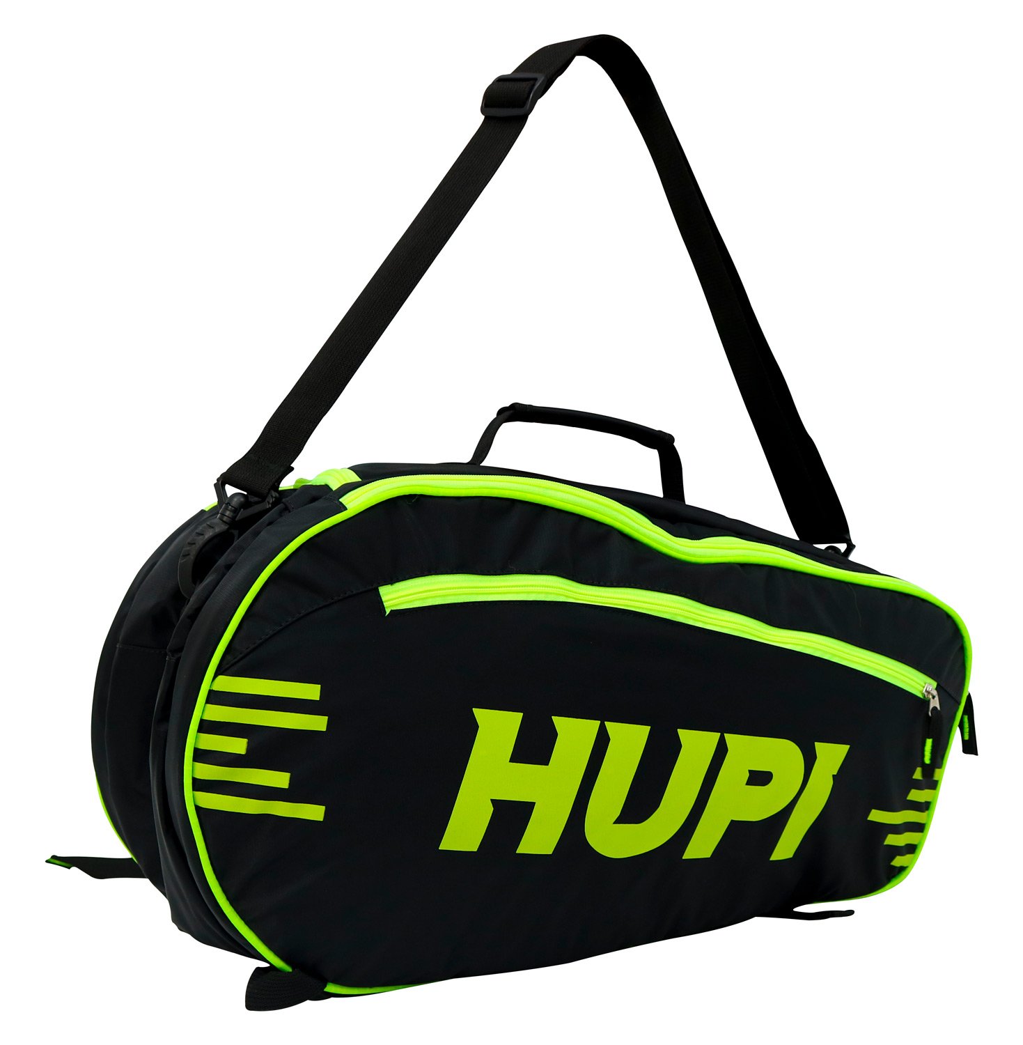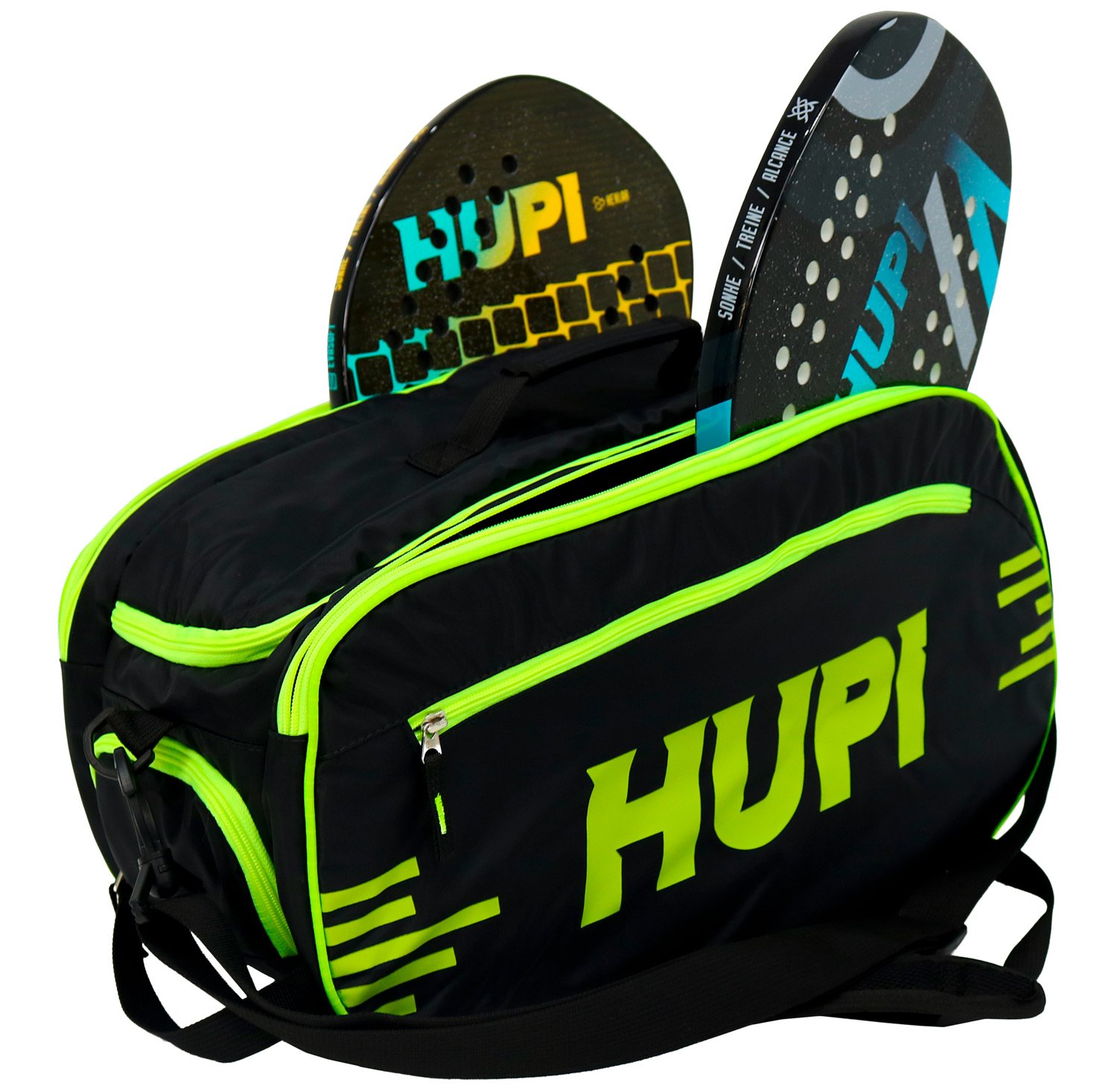 Raqueteira para Beach Tennis e Padel da HUPI, possui espaço para transportar com segurança duas raquetes com capa, com proteção acolchoada. Bolso extra para bolinhas. Possui compartimento separado e grande no meio para carregar demais acessórios e vestuário, como toalhas, roupas, garrafinha de água, e demais itens necessários para seu treino. Dois compartimentos laterias com zíper para transportar separadamente itens menores, como chaves e celular.