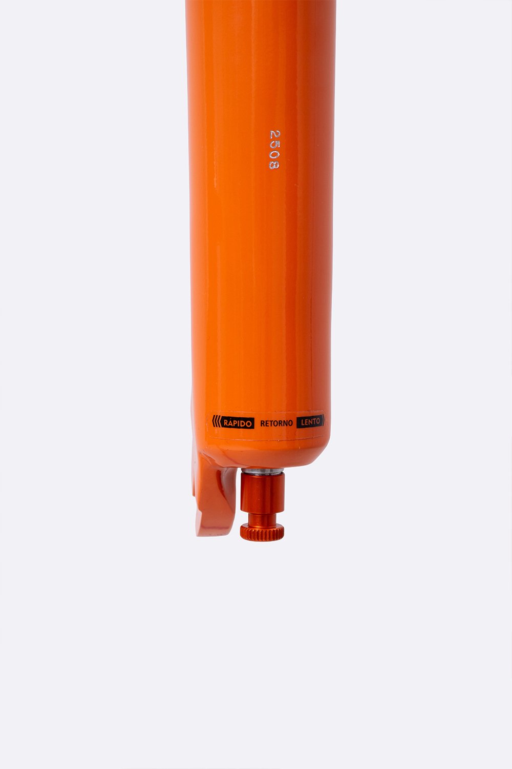 O botão de retorno, localizado na base da perna hidráulica, permite ajustar a velocidade com que a suspensão volta à posição inicial: sentido horário para retorno mais rápido e anti-horário para retorno mais lento.