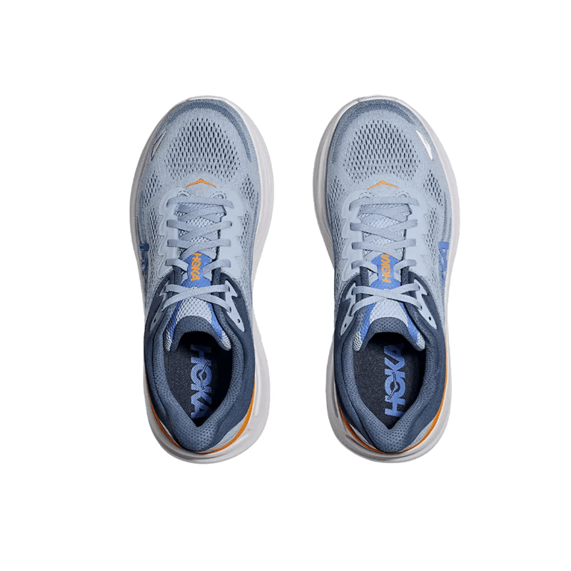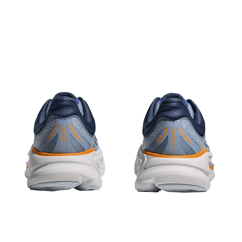 O Tênis HOKA Bondi 9 Masculino Azul/Laranja é a escolha definitiva para quem busca conforto extremo sem abrir mão da leveza.