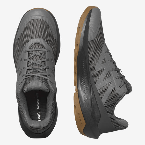 A geometria Reverse Camber (R-Camber), inspirada na herança da Salomon no esqui, reduz o tempo de contato com o solo, favorecendo transições suaves e ajudando a diminuir a fadiga muscular mesmo após longas caminhadas.