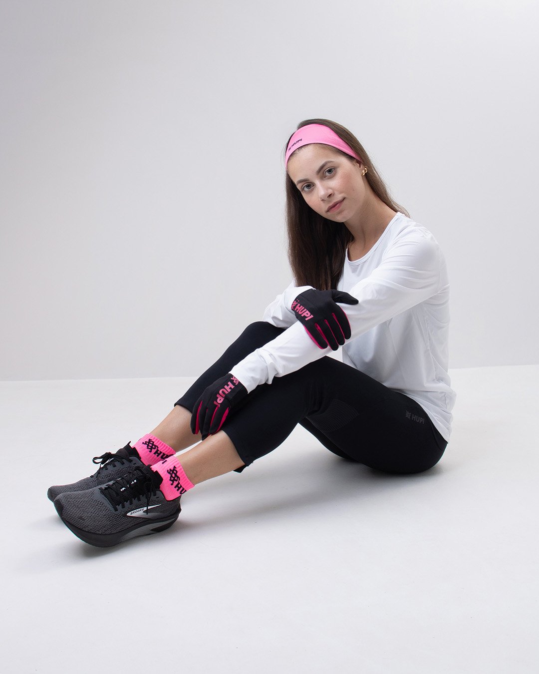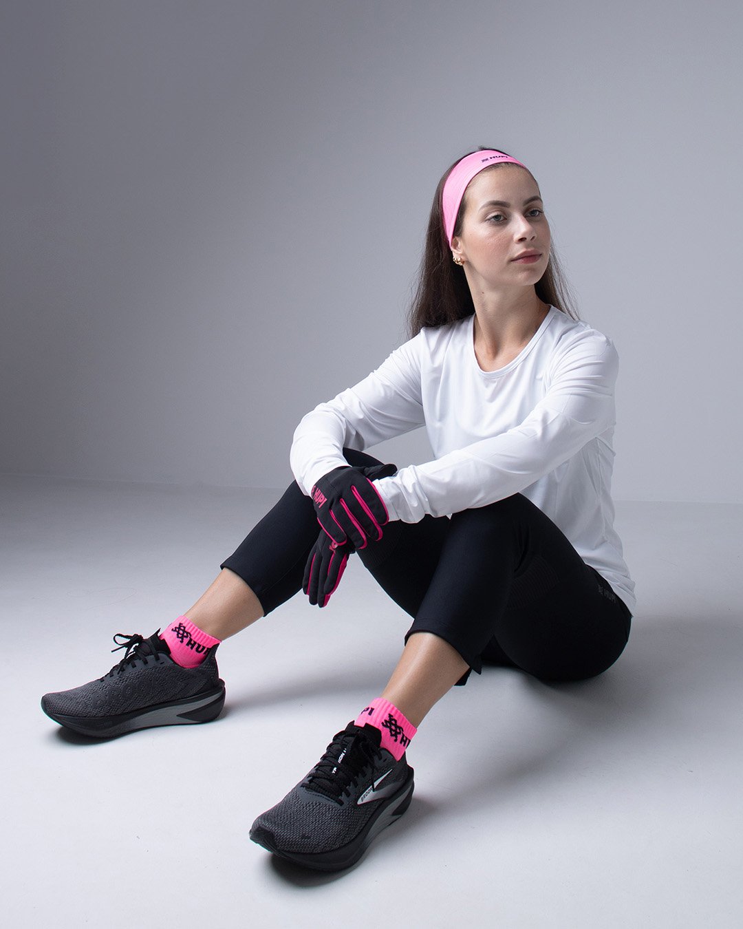 A cor rosa vibrante adiciona personalidade ao look esportivo, sem abrir mão da performance.